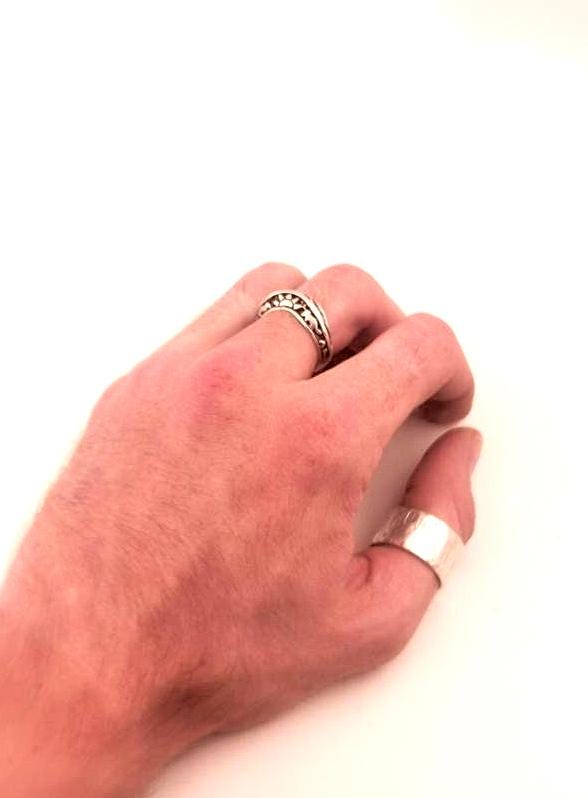 Thick unisex ring made of 925 silver with tribal design. The design features a setting/rising sun, multiple animals and tents. The motive is hollow from the backside to prevent it from turning on your finger while the ring maintains a decent weight.
