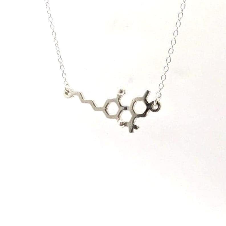 A detailed THC molecular structure necklace handcrafted in solid 925 sterling silver. This pendant represents tetrahydrocannabinol, the most recognized natural compound in the cannabis plant, appreciated in scientific, botanical and biochemical contexts.