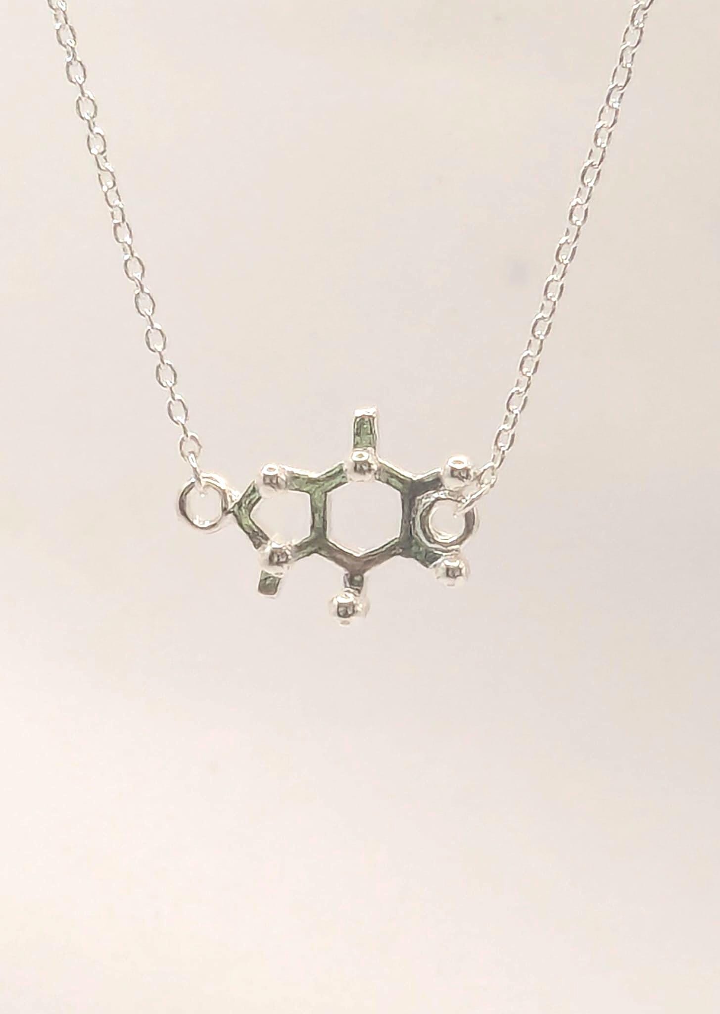 A detailed caffeine molecule necklace handcrafted in solid 925 sterling silver or 18k gold-plated silver. This pendant represents the molecular structure of caffeine — the natural stimulant found in coffee, tea and cacao.