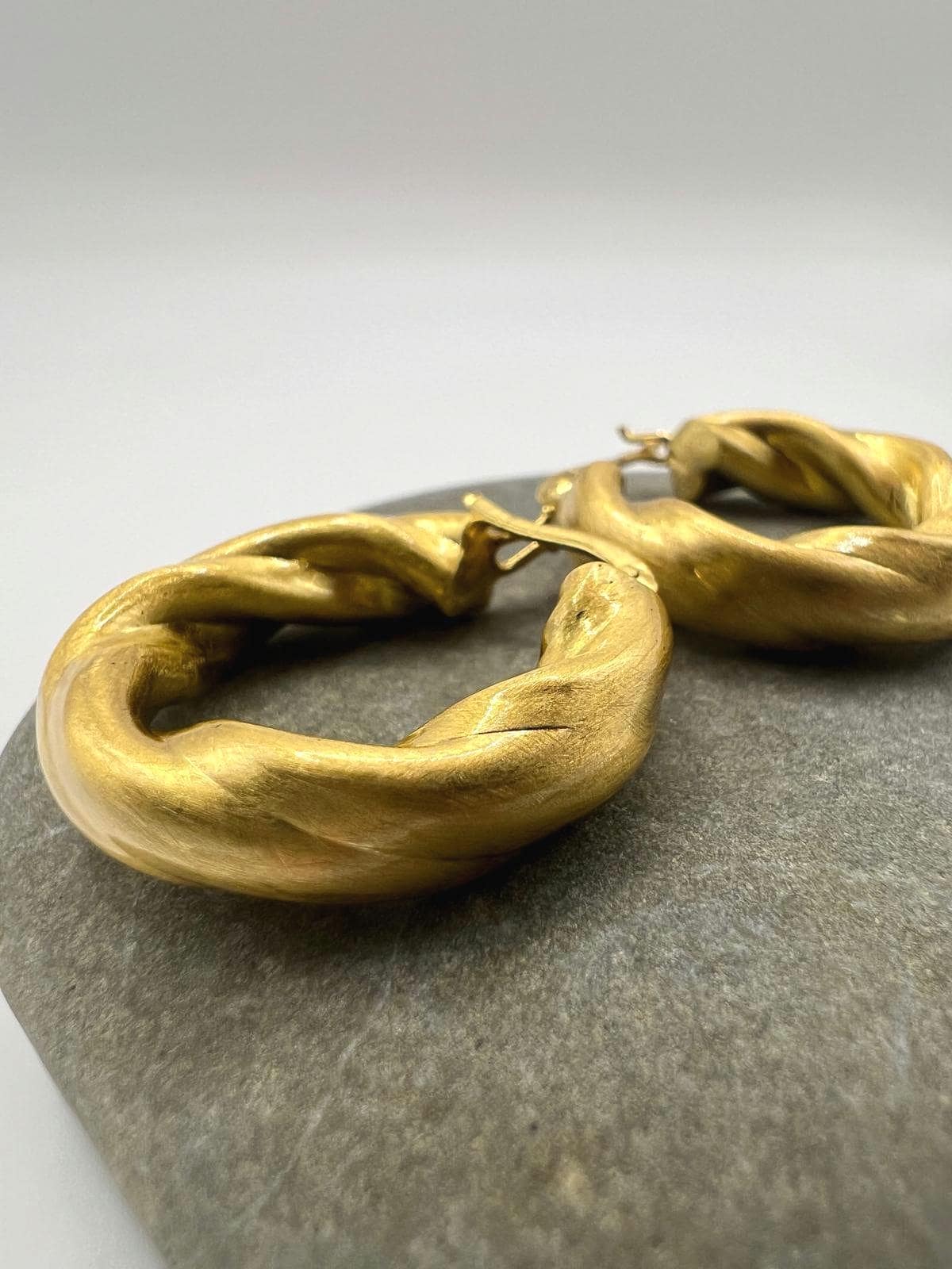 These statement hoop earrings feature a distinctive twisted rope texture that creates dynamic visual interest and dimension. The sculptural spiral design catches light from every angle, while the matte finish adds a sophisticated, contemporary touch. The substantial thickness gives these hoops a bold presence that commands attention while remaining elegant and wearable.
