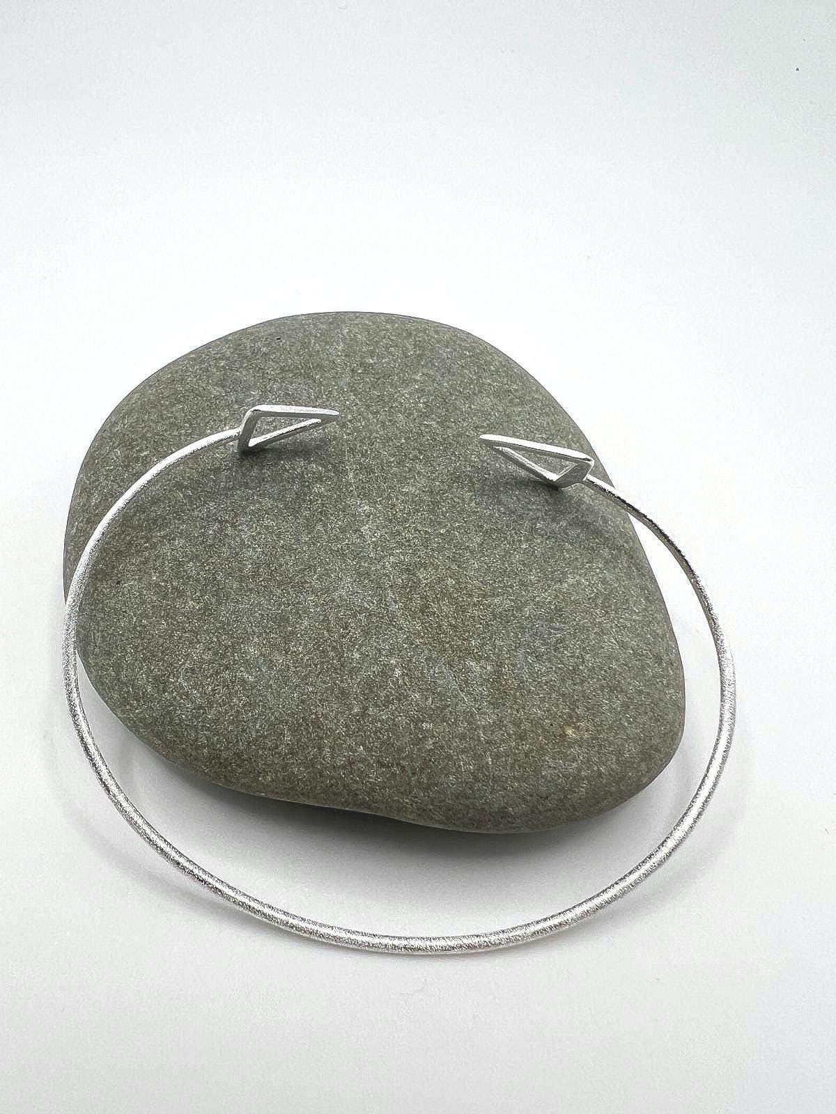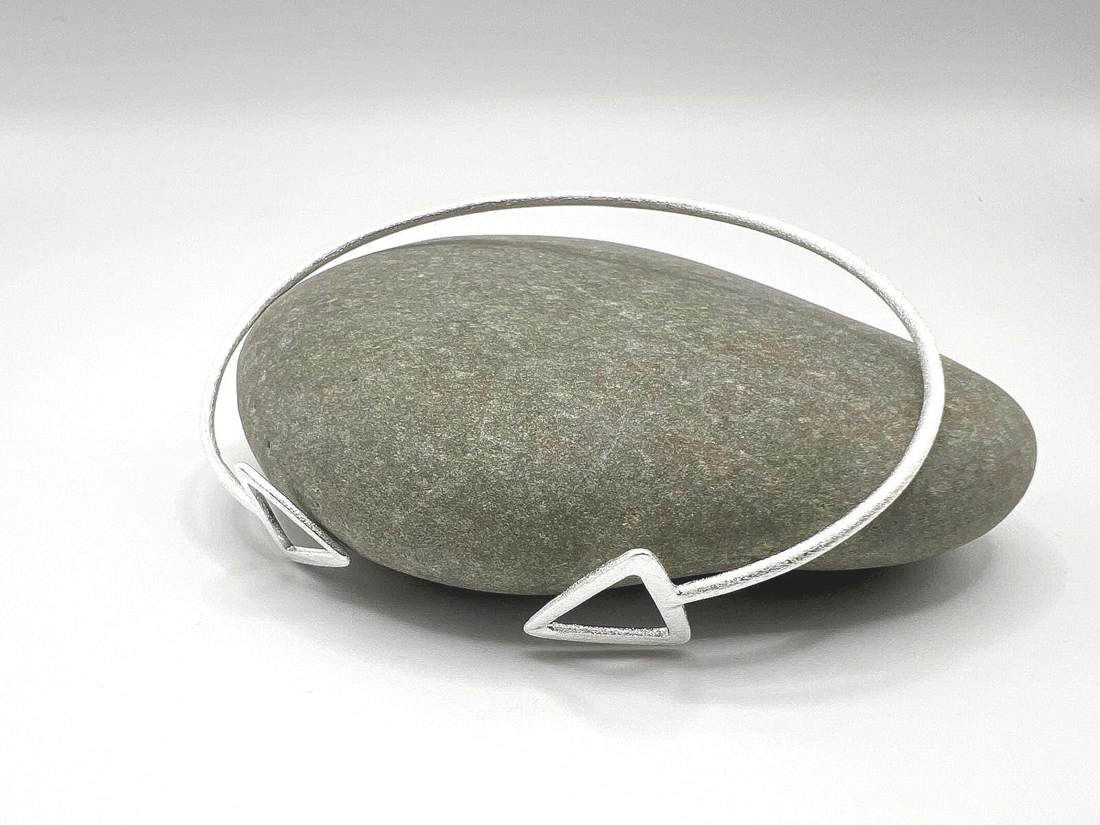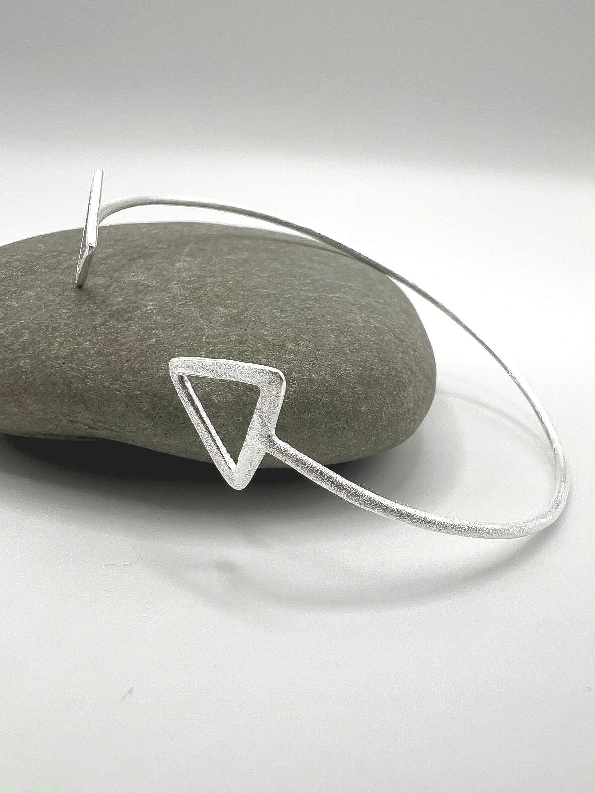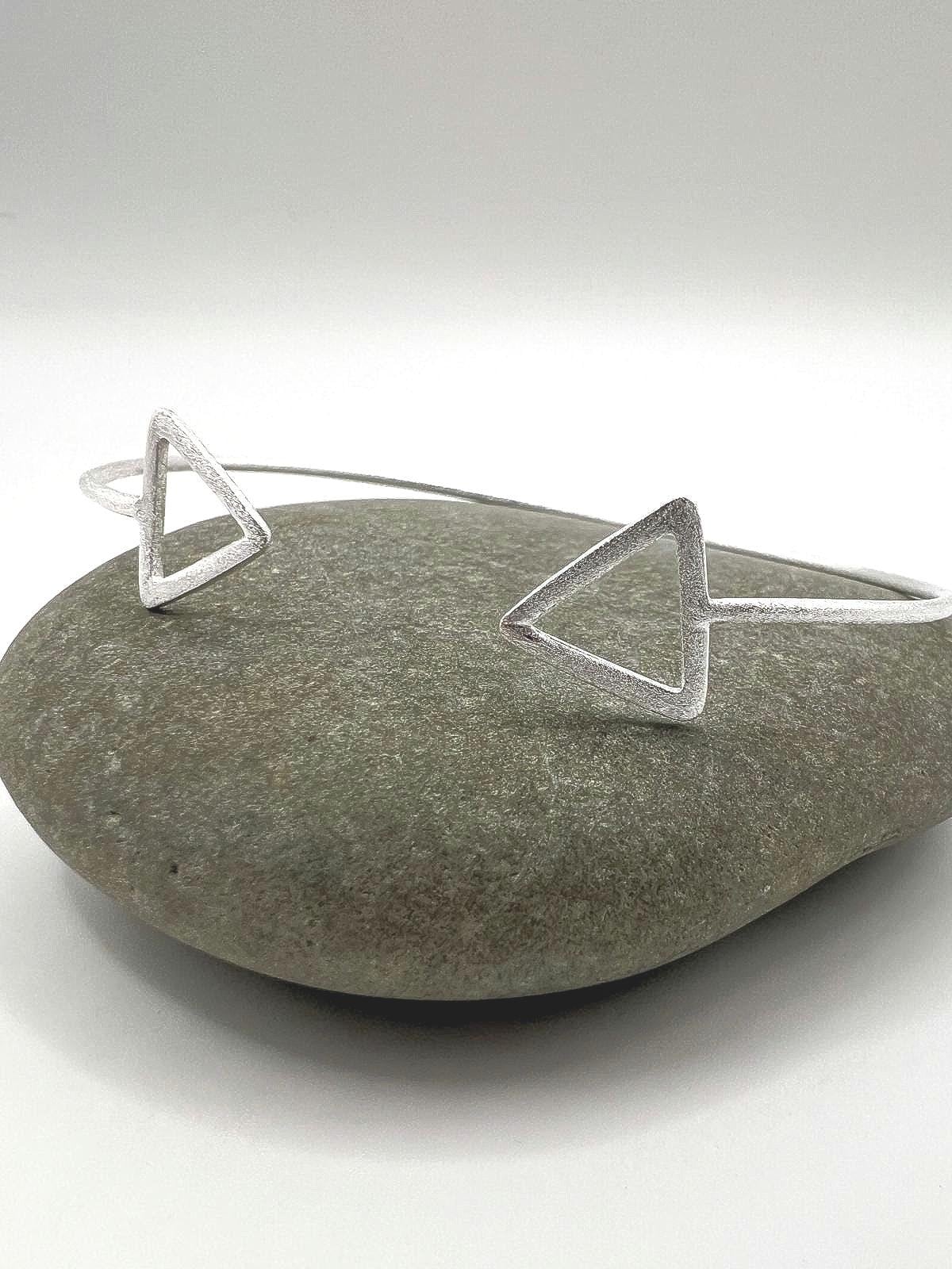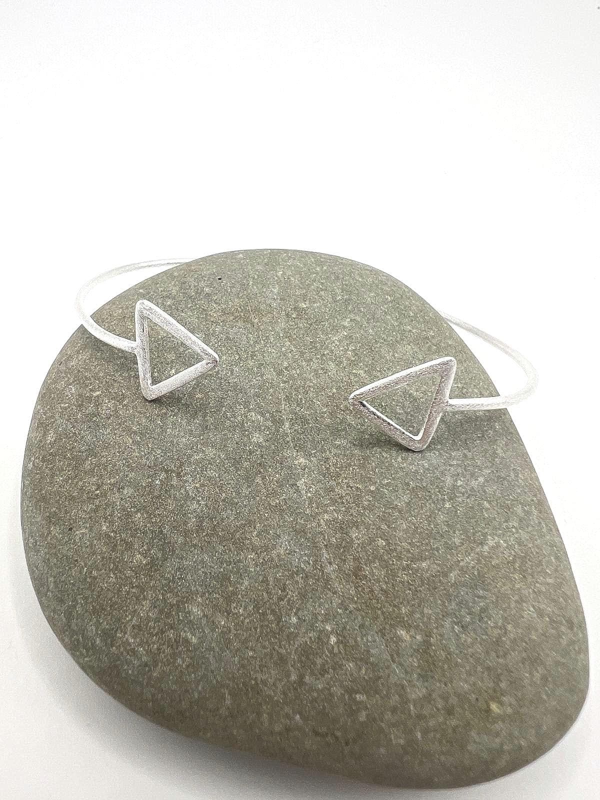 The triangle symbolises strength, stability, and balance. The open cuff design allows for easy adjustment and comfortable wear while maintaining its elegant form. The sophisticated matte finish gives the bracelet a modern, understated luxury that complements any style. This piece makes a confident statement without being overwhelming, perfect for stacking with other bracelets or wearing alone as a focal point. The substantial yet lightweight construction ensures all-day comfort.