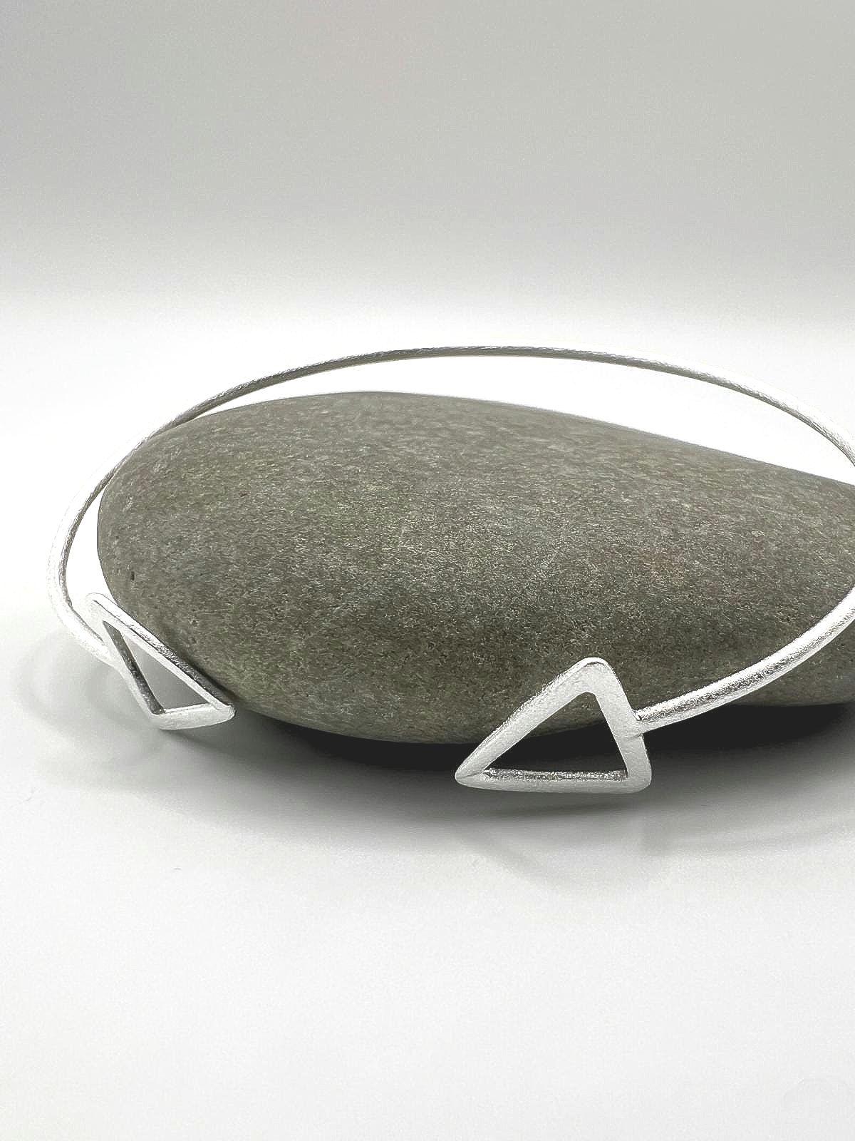 This striking open cuff bracelet features two geometric triangles positioned at the opening, creating a bold yet refined statement. The triangular elements showcase a beautiful textured matte finish that contrasts subtly with the smooth cuff band. The architectural design combines clean lines with organic texture, making it a versatile piece that bridges contemporary and timeless aesthetics.