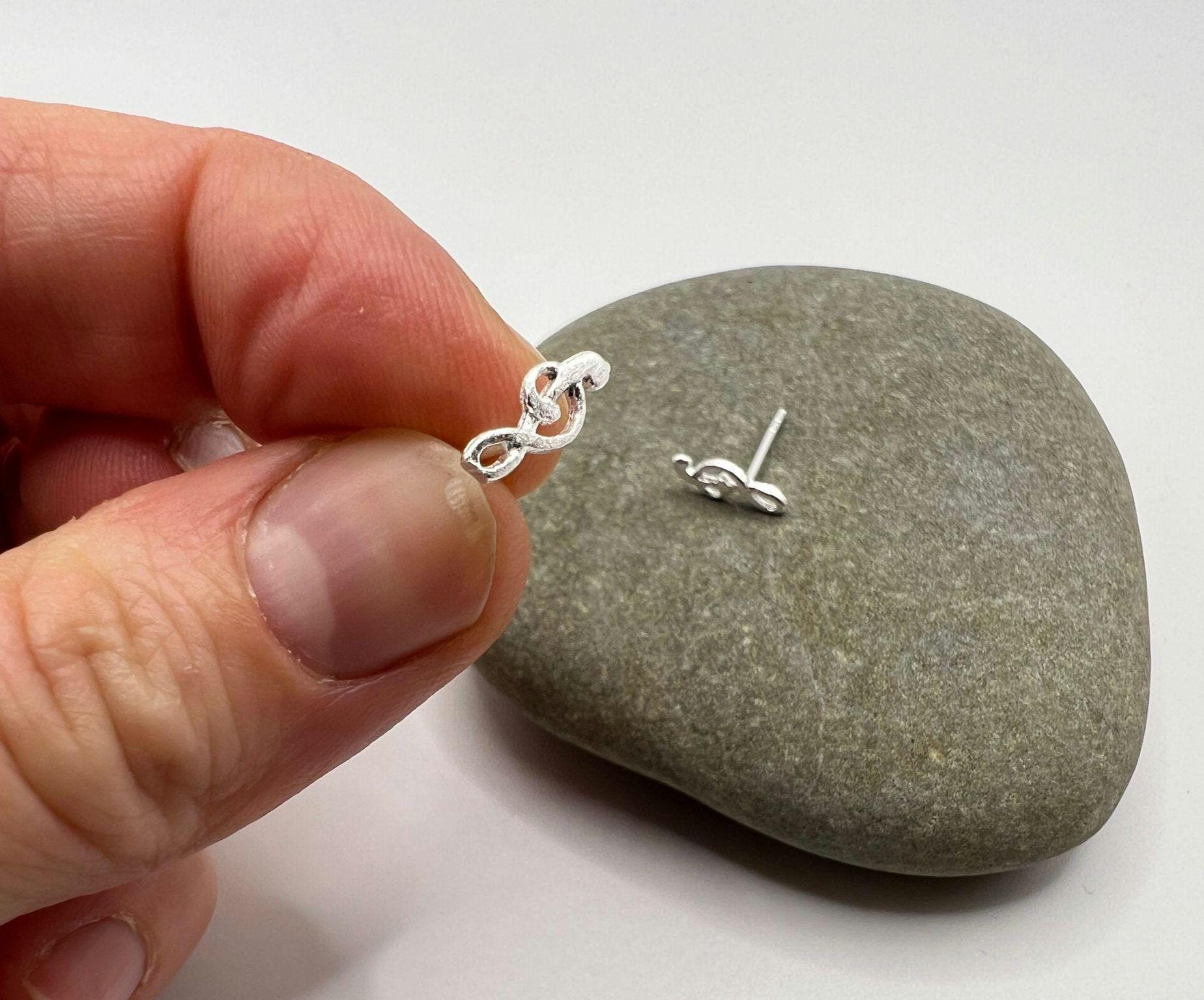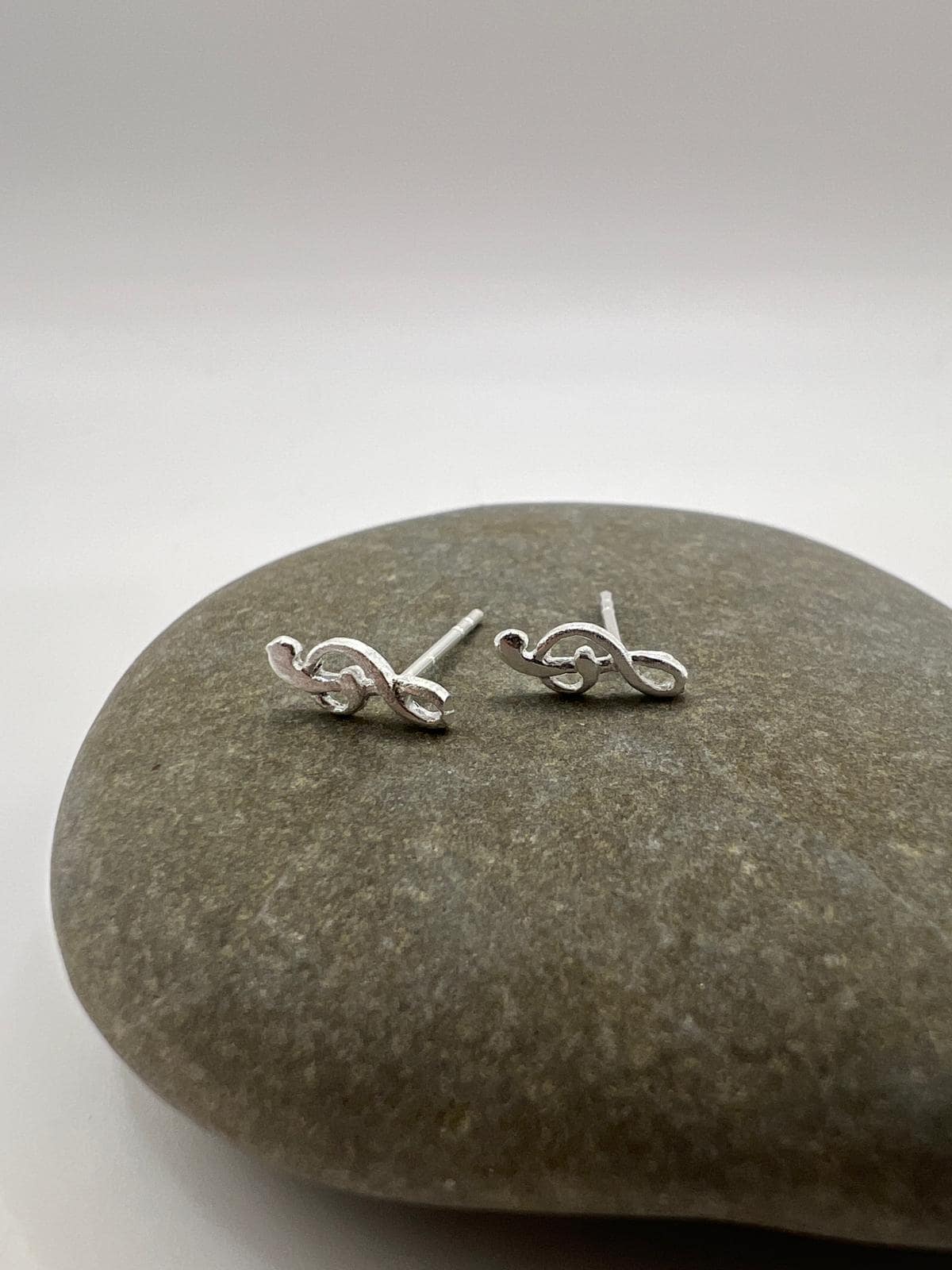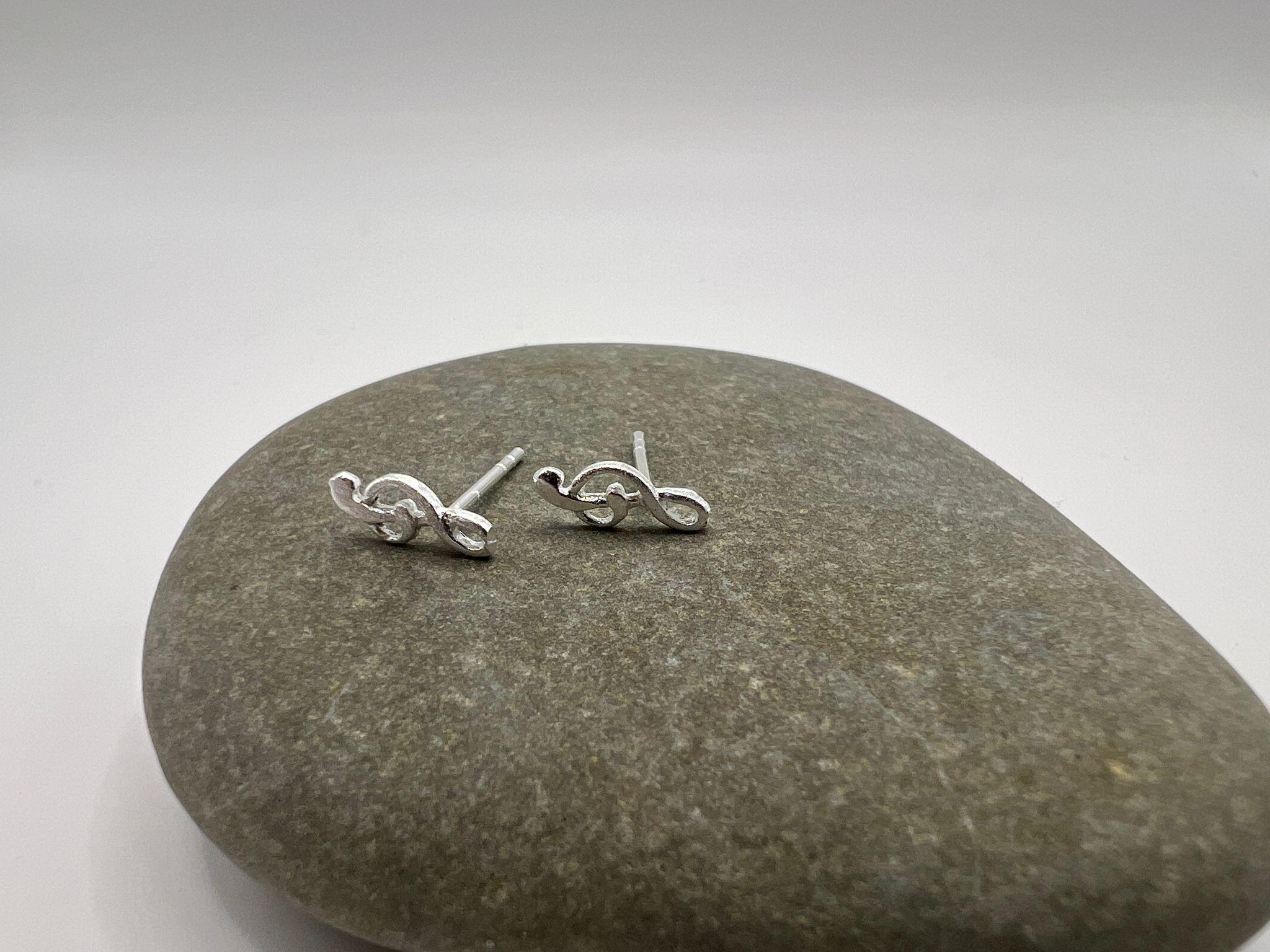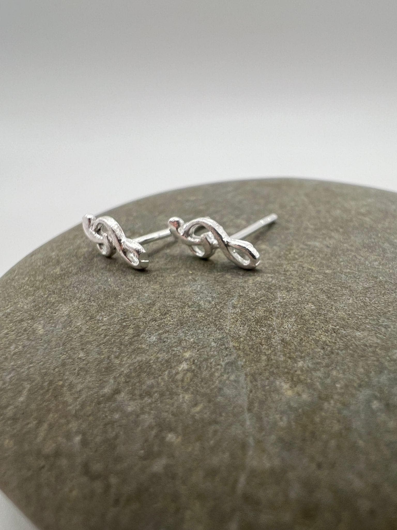 Delicate musical note stud earrings handcrafted from 925 sterling silver with a beautiful matte finish. These charming miniature treble clefs feature graceful, flowing curves that capture the elegance of musical notation. The refined sculptural details make them perfect conversation starters that celebrate the universal language of music and the passion of those who live and breathe it.