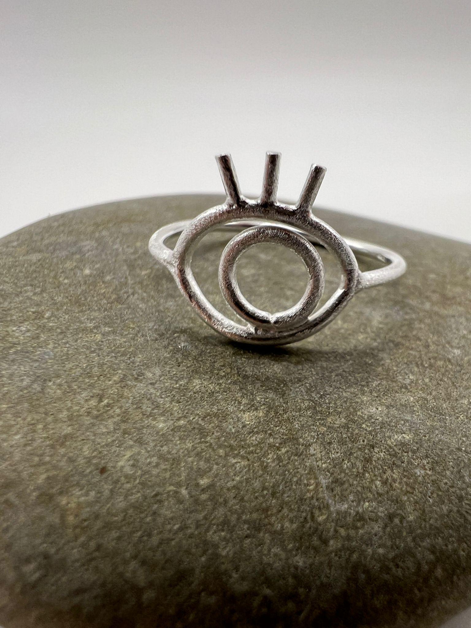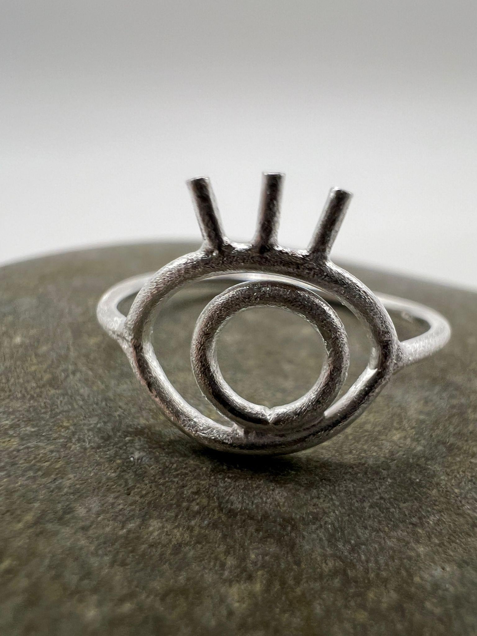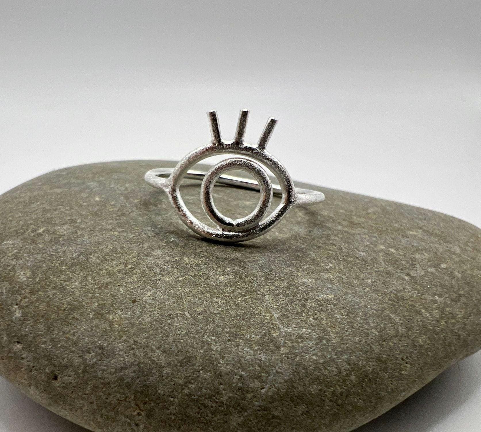 Delicate eye motif ring handcrafted from 925 sterling silver with a beautiful matte finish. This mystical ring features a simple yet powerful eye symbol with three radiating lines above, creating a captivating talisman on a slim, comfortable band. The minimalist design makes it perfect for everyday spiritual wear, offering both style and symbolic protection.