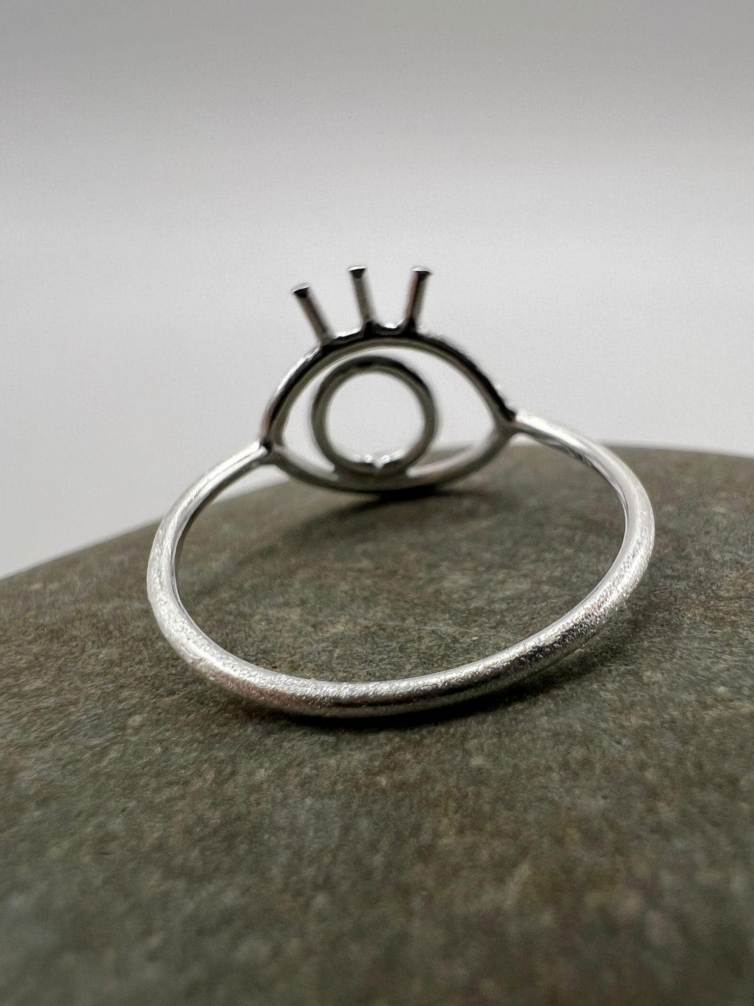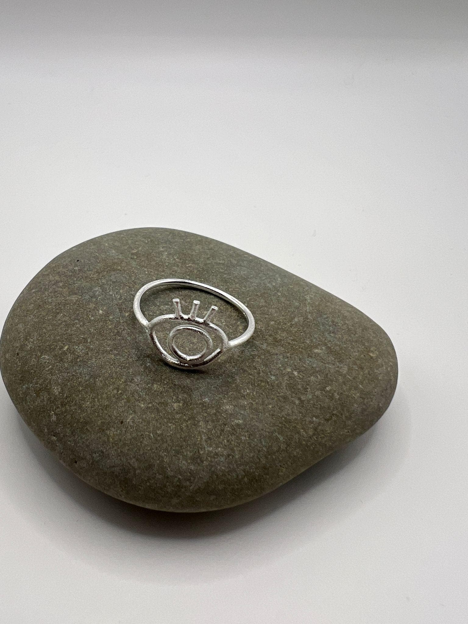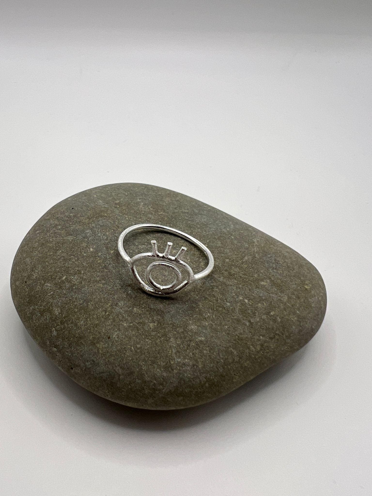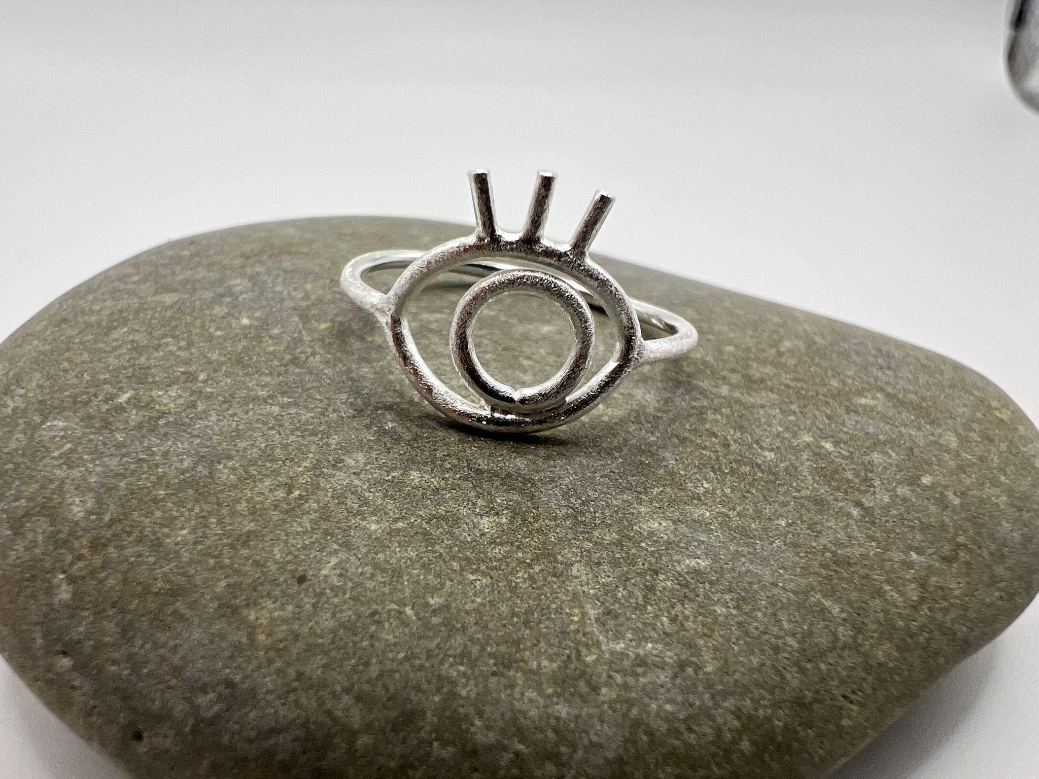 Delicate eye motif ring handcrafted from 925 sterling silver with a beautiful matte finish. This mystical ring features a simple yet powerful eye symbol with three radiating lines above, creating a captivating talisman on a slim, comfortable band. The minimalist design makes it perfect for everyday spiritual wear, offering both style and symbolic protection.