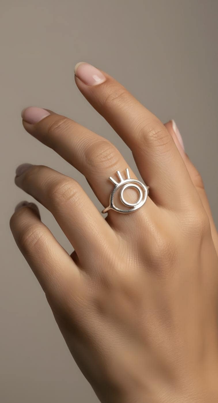 This eye ring celebrates one of humanity's most ancient and universal symbols of protection. The eye has been revered across cultures for thousands of years - from the Egyptian Eye of Horus to the Greek evil eye (mati), from the Turkish nazar to the Hamsa hand's protective gaze. The eye symbol represents awareness, spiritual insight, divine watchfulness, and protection from negative energy and ill intentions. In many traditions, wearing an eye symbol is believed to deflect harmful looks and keep the wearer safe from envy and misfortune. The three rays above the eye can represent eyelashes, divine light, or the awakening of higher consciousness - a nod to the concept of the "third eye" that sees beyond physical reality into spiritual truths. This ring is perfect for anyone seeking spiritual protection, cultivating mindfulness and awareness, or simply drawn to mystical symbolism. The delicate band keeps the focus on the eye itself, while the matte finish gives it a contemporary, wearable quality that transitions seamlessly from meditation practice to everyday life.