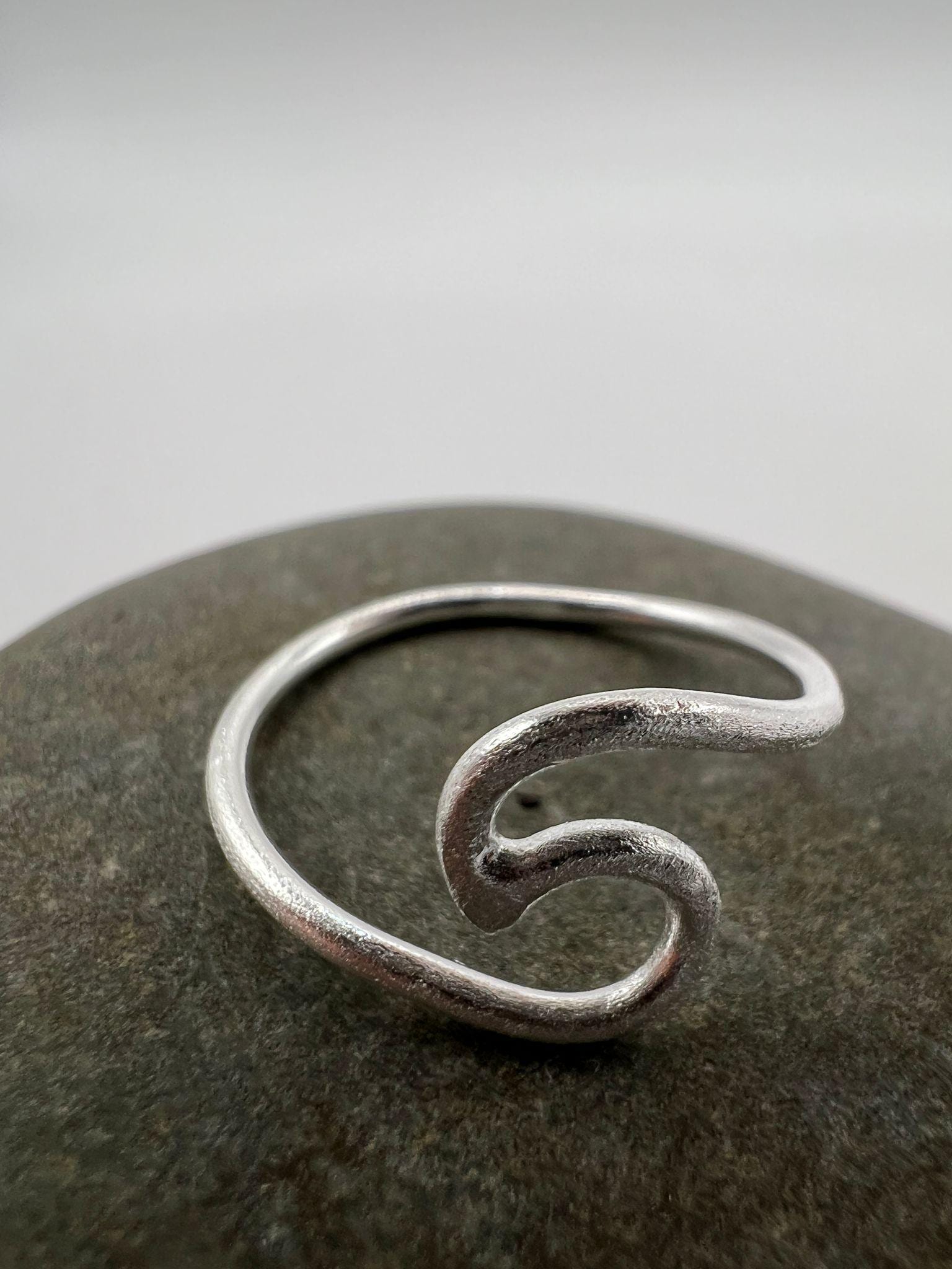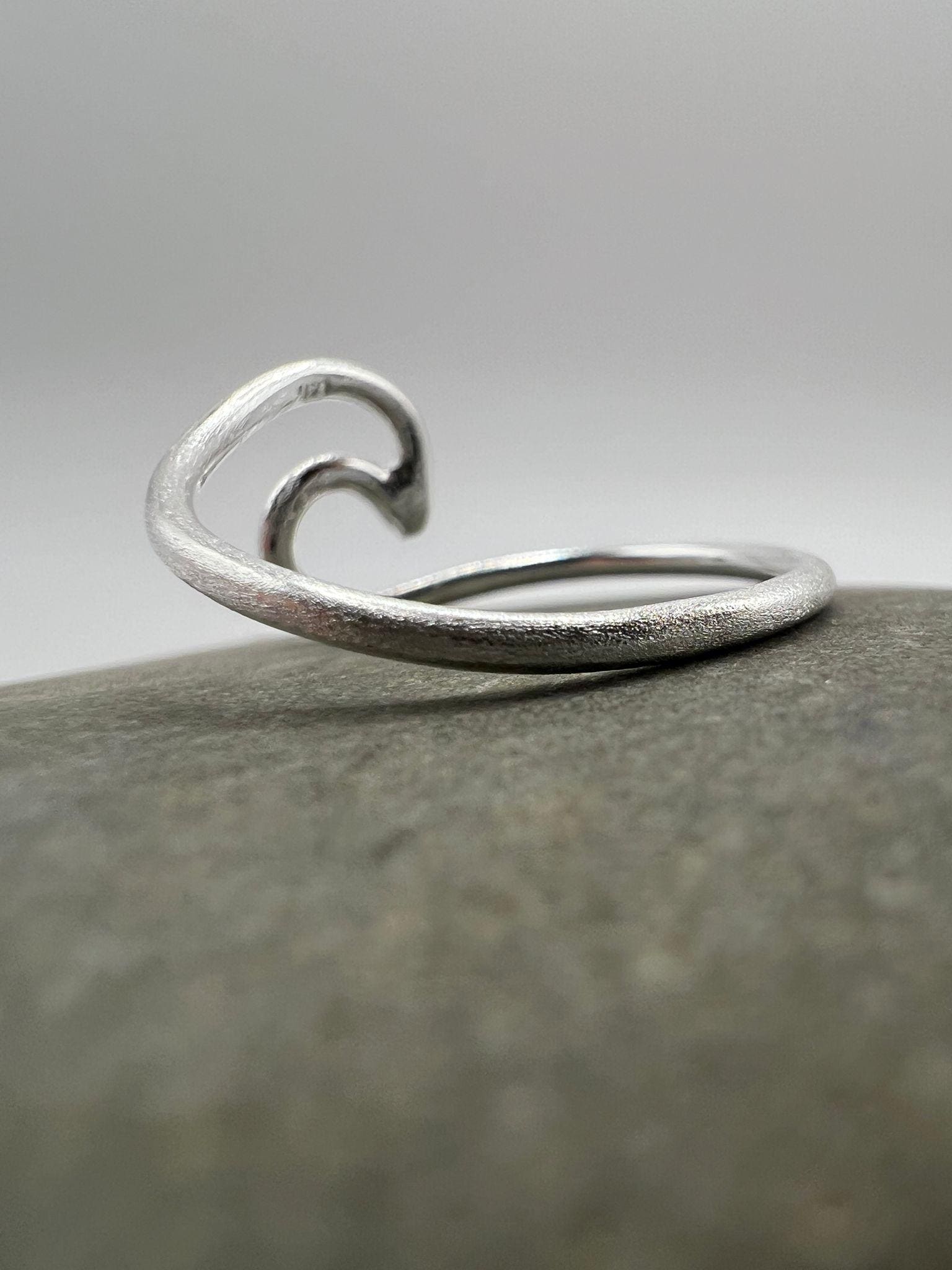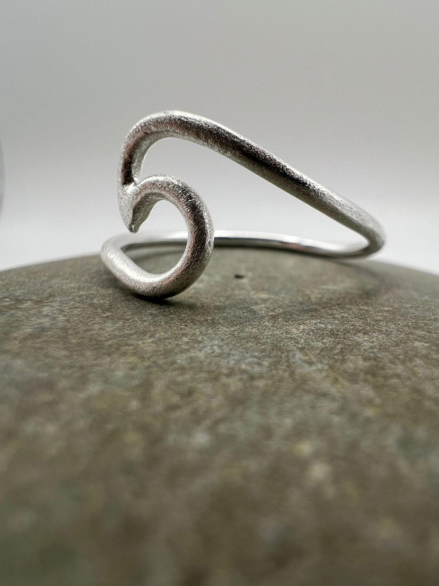Delicate wave ring handcrafted from 925 sterling silver with a beautiful matte finish. This elegant ring features a graceful spiral wave curl that wraps around a slim, comfortable band. The flowing organic form captures the essence of ocean waves in their eternal dance, creating a wearable piece of the sea's timeless beauty.