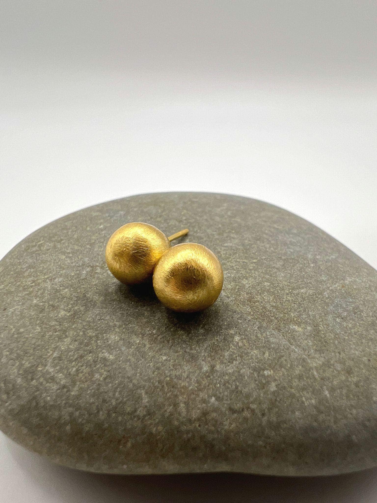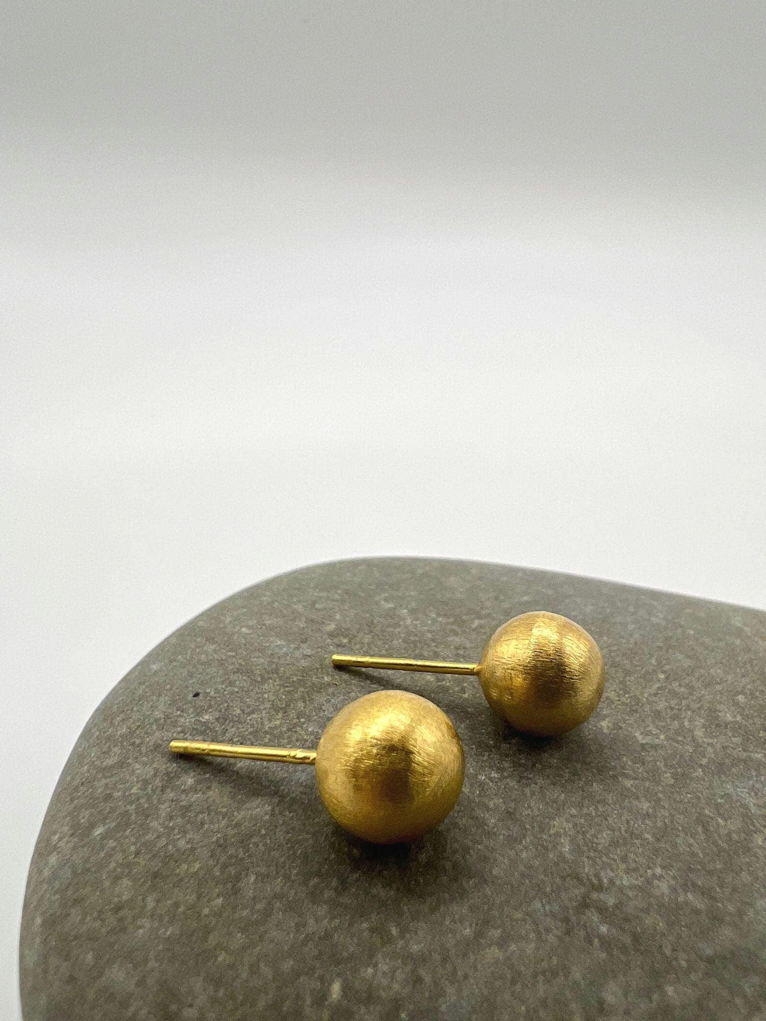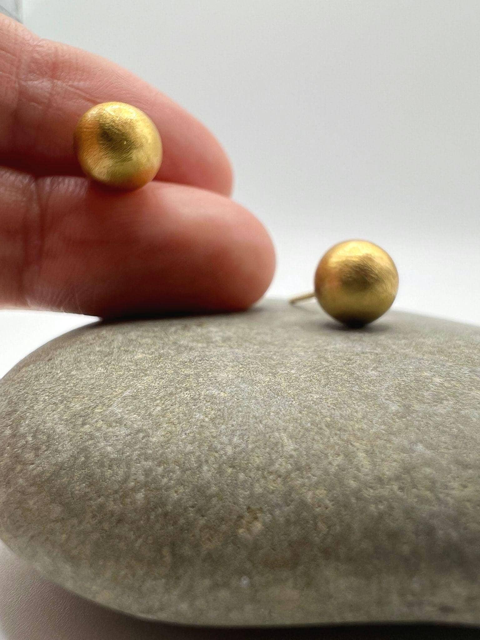 Classic ball stud earrings handcrafted from 925 sterling silver with luxurious 18K gold plating and a beautiful matte finish. These timeless 7mm sphere studs feature a soft brushed texture that creates an elegant, warm glow. The perfect size for everyday wear - substantial enough to be noticed yet refined enough to complement any style from casual to formal.