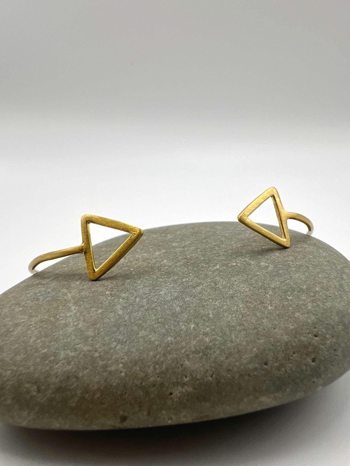 The triangle symbolises strength, stability, and balance. The open cuff design allows for easy adjustment and comfortable wear while maintaining its elegant form. The sophisticated matte gold finish gives the bracelet a modern, understated luxury that complements any style - from casual everyday wear to special occasions. The warmth of gold adds richness without being flashy, making this piece perfect for those who appreciate subtle luxury. This bracelet makes a confident statement without being overwhelming, ideal for stacking with other bracelets or wearing alone as a focal point. The substantial yet lightweight construction ensures all-day comfort.