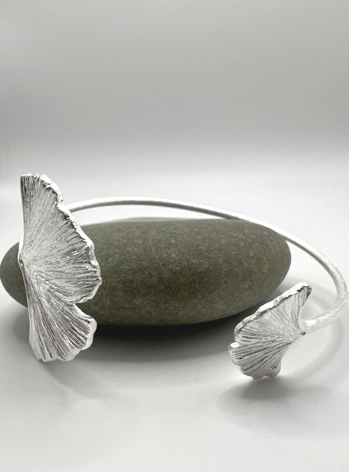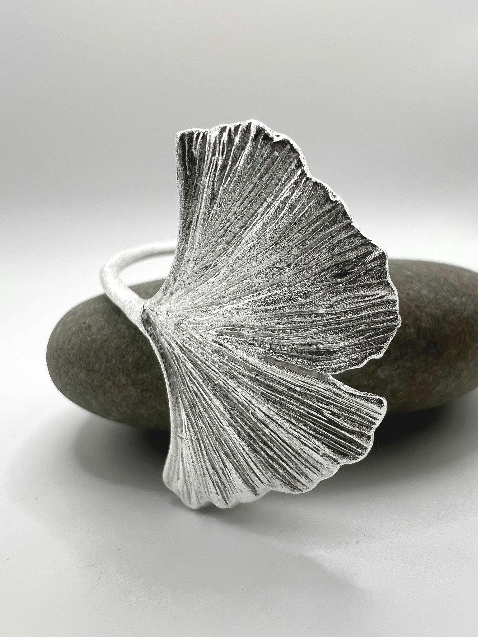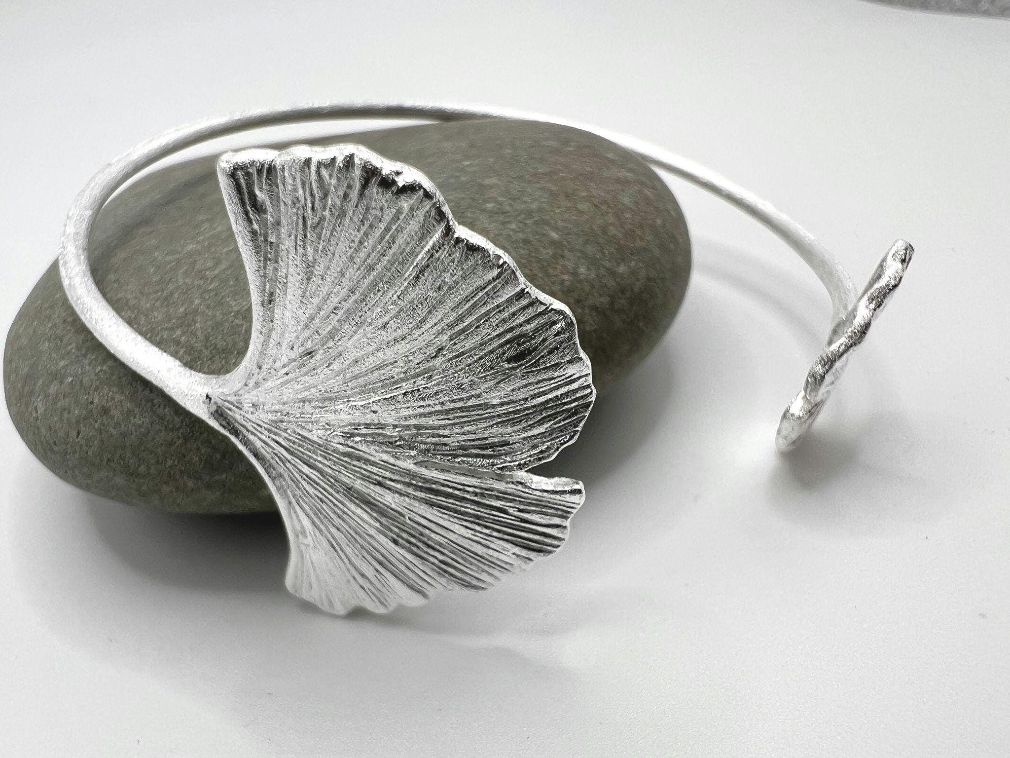 A beautifully crafted open cuff inspired by the iconic ginkgo leaf, symbol of long life, resilience, and natural harmony. Hand-cast in solid 925 silver with a soft matte texture, this statement bracelet balances organic elegance with minimalist design.