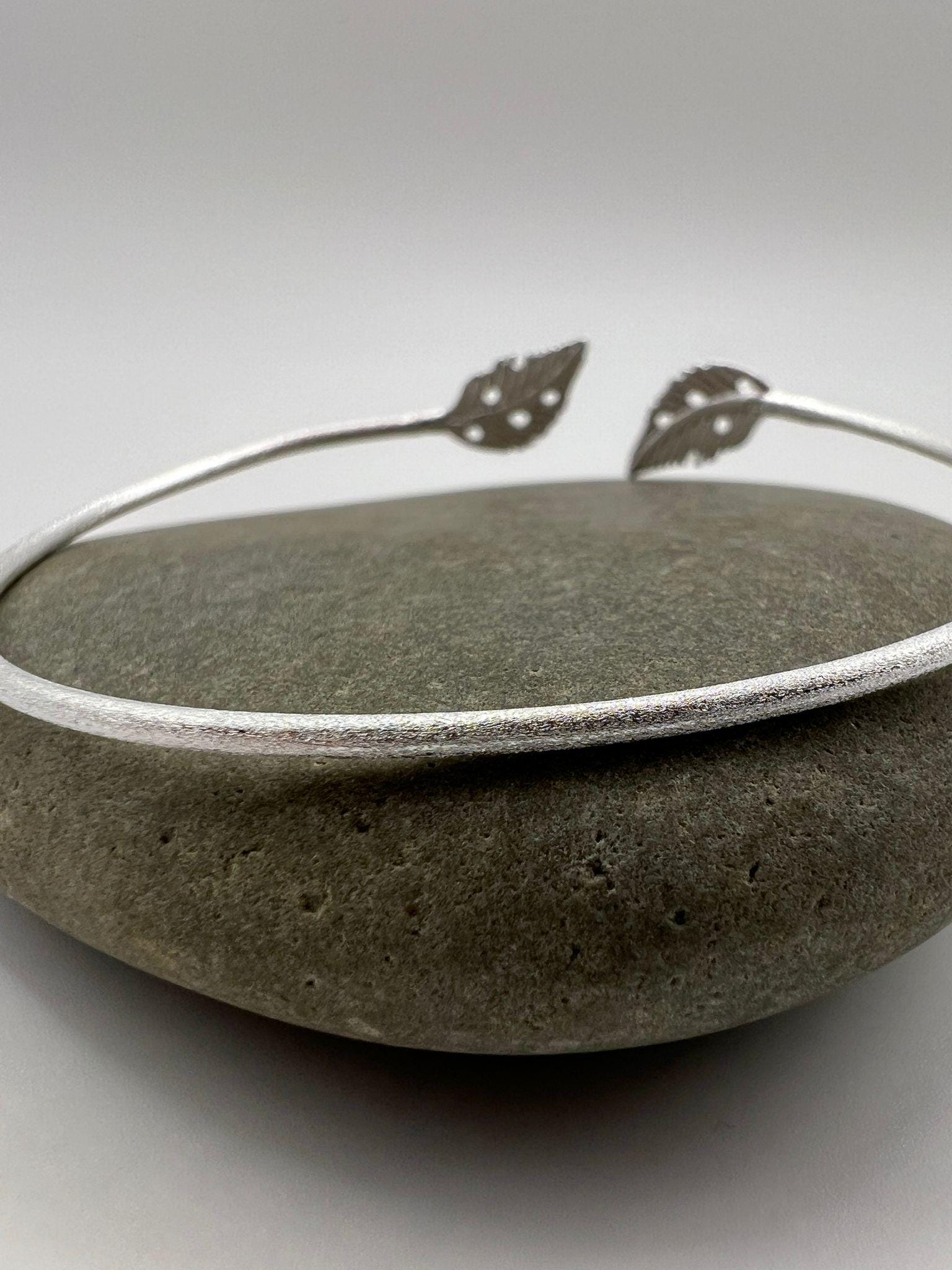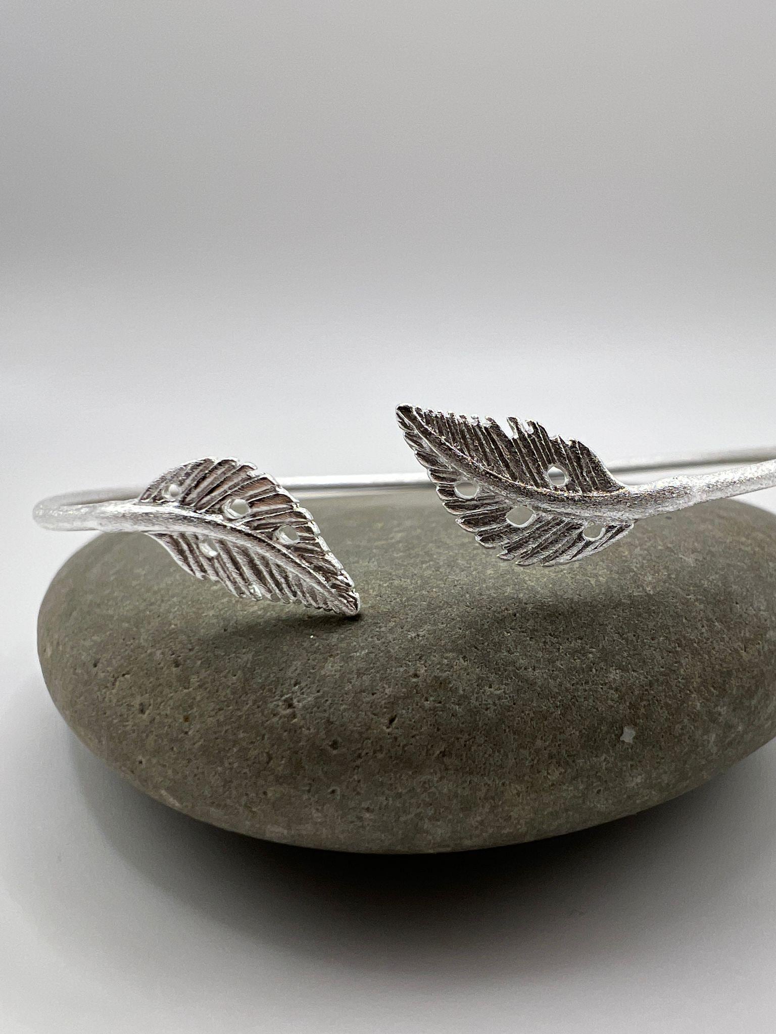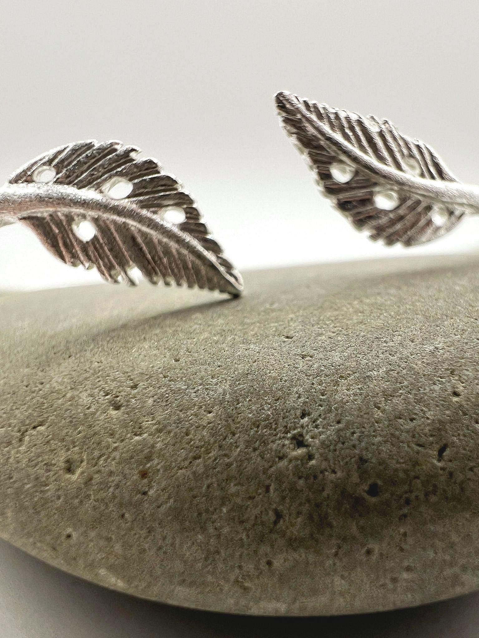 Minimalist adjustable bracelet crafted from genuine 925 sterling silver with a soft matte finish. The open cuff ends in two detailed leaf motifs, creating a delicate nature-inspired piece suitable for everyday wear.