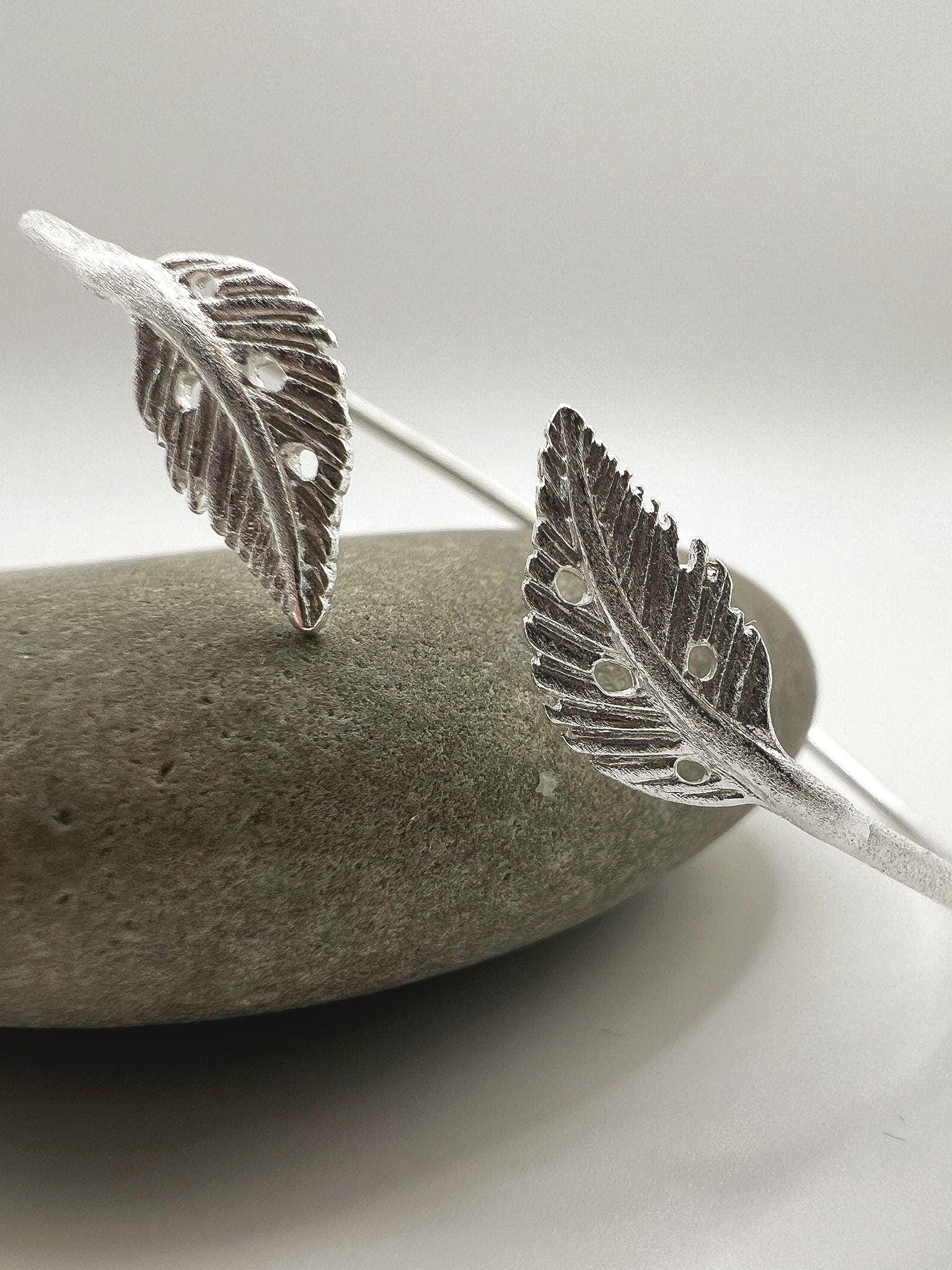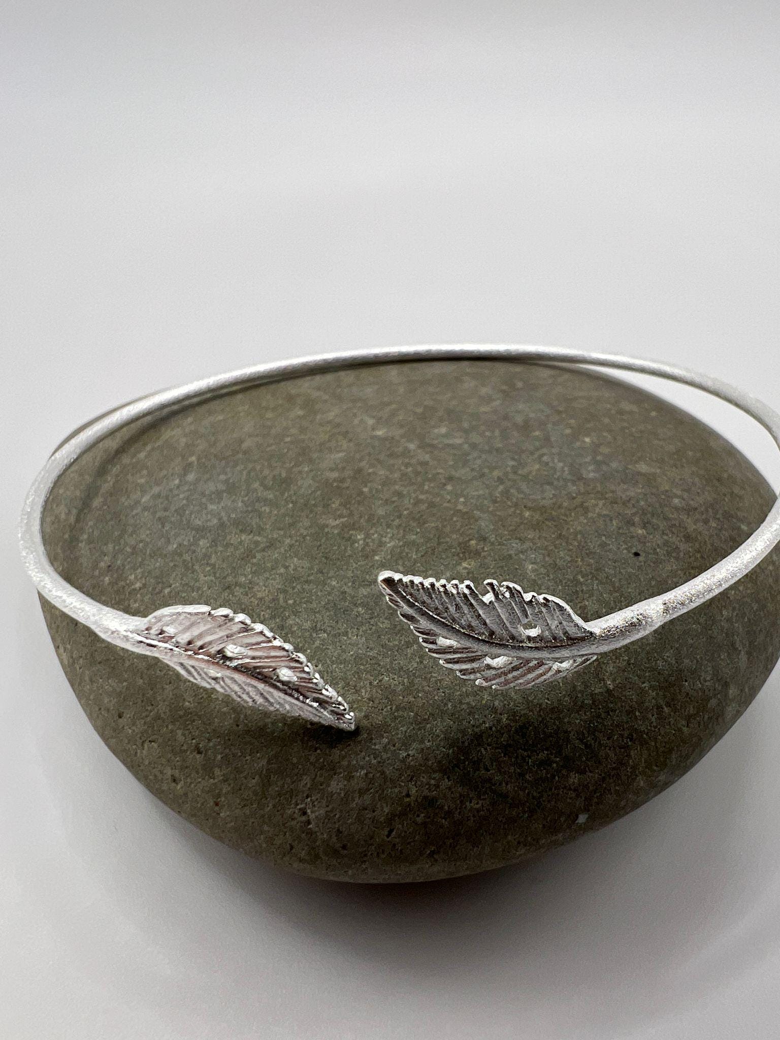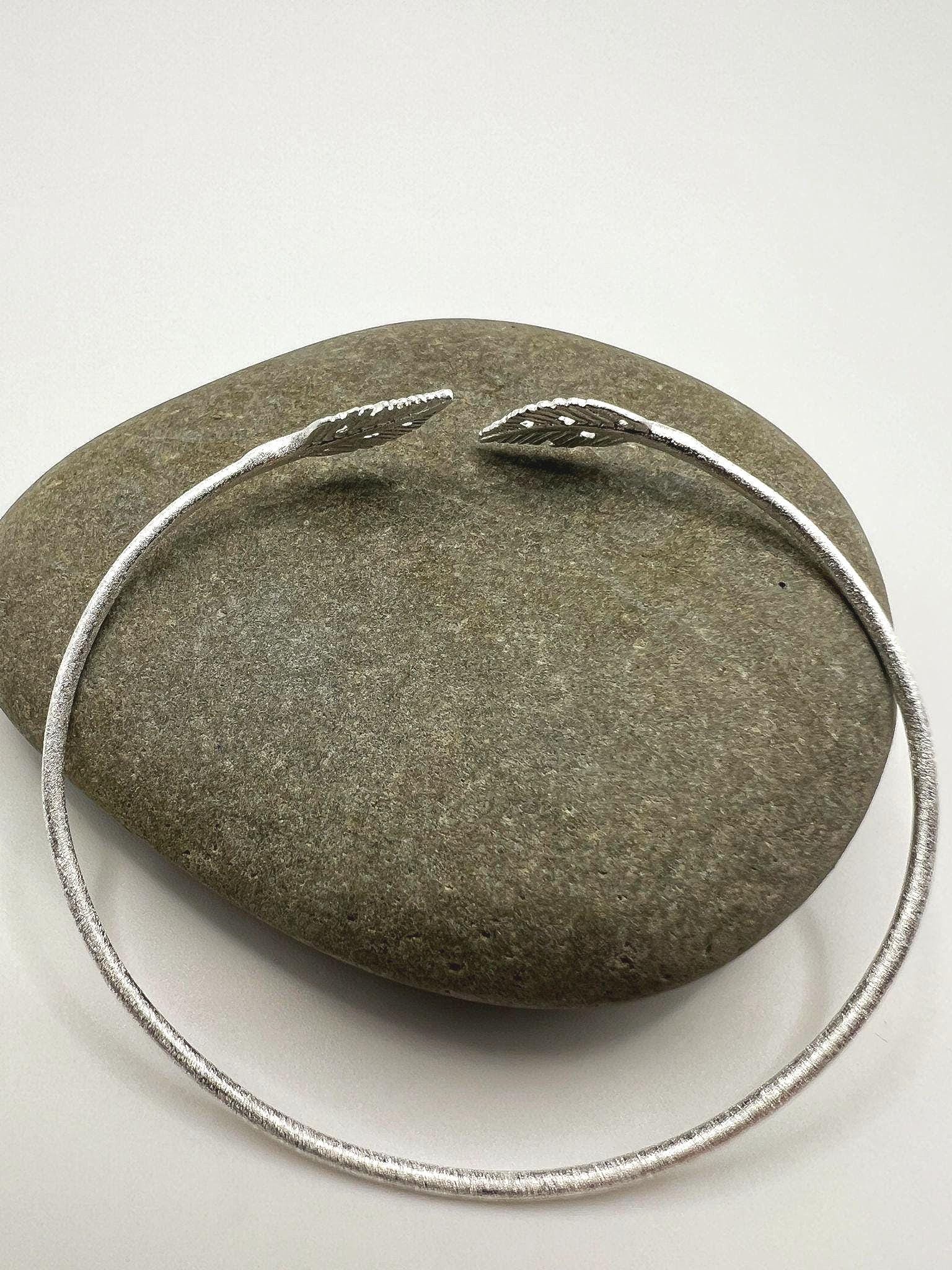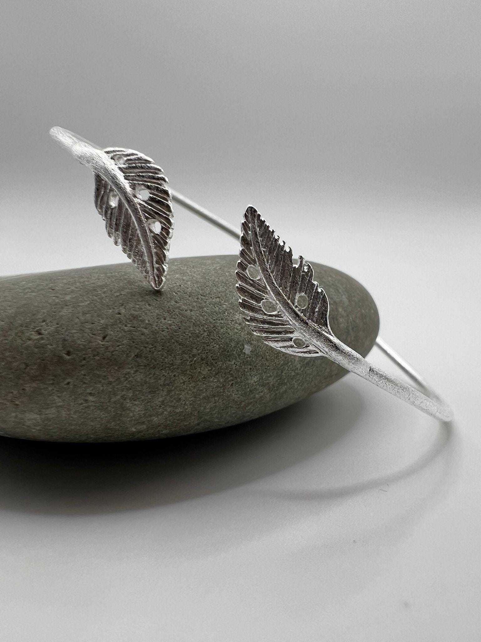 Minimalist adjustable bracelet crafted from genuine 925 sterling silver with a soft matte finish. The open cuff ends in two detailed leaf motifs, creating a delicate nature-inspired piece suitable for everyday wear.