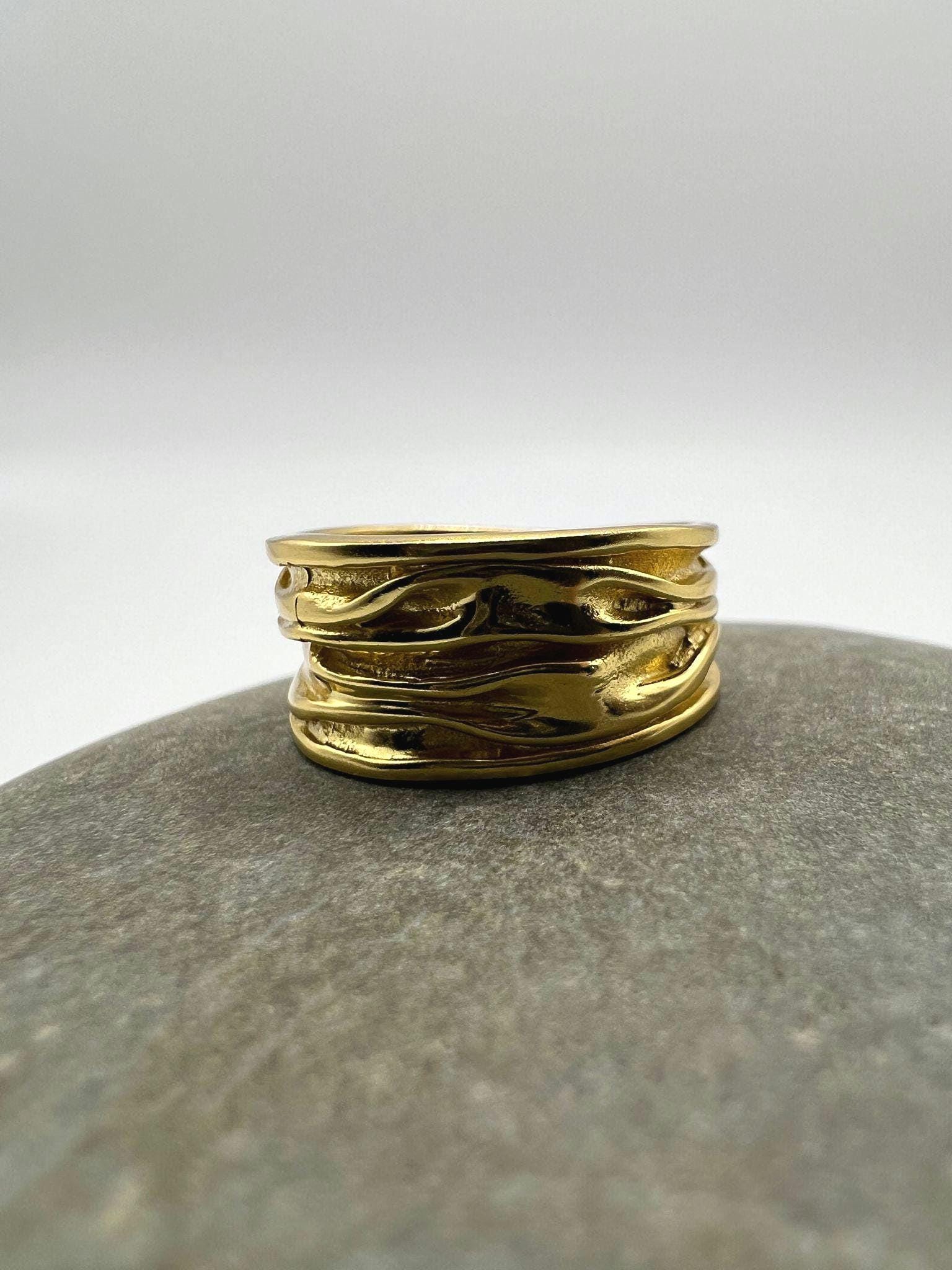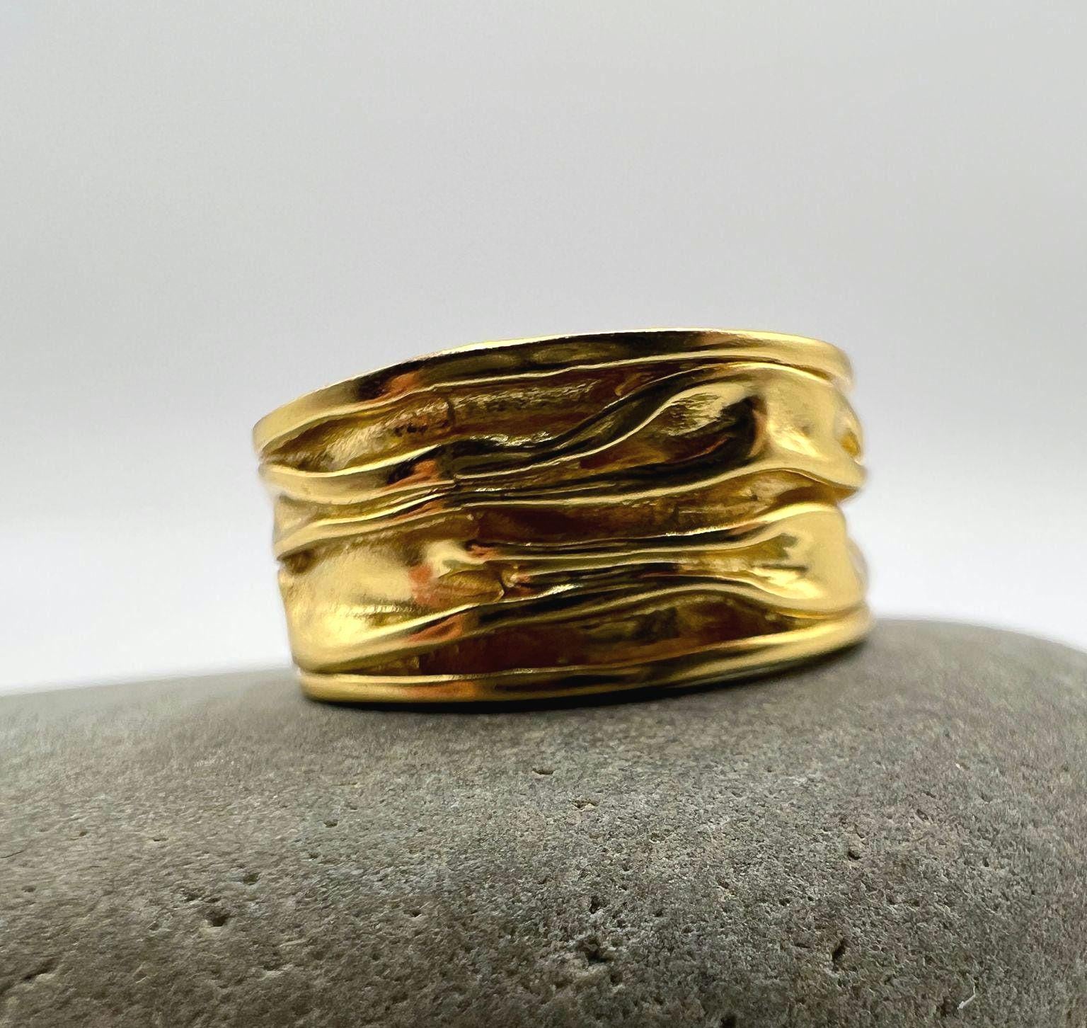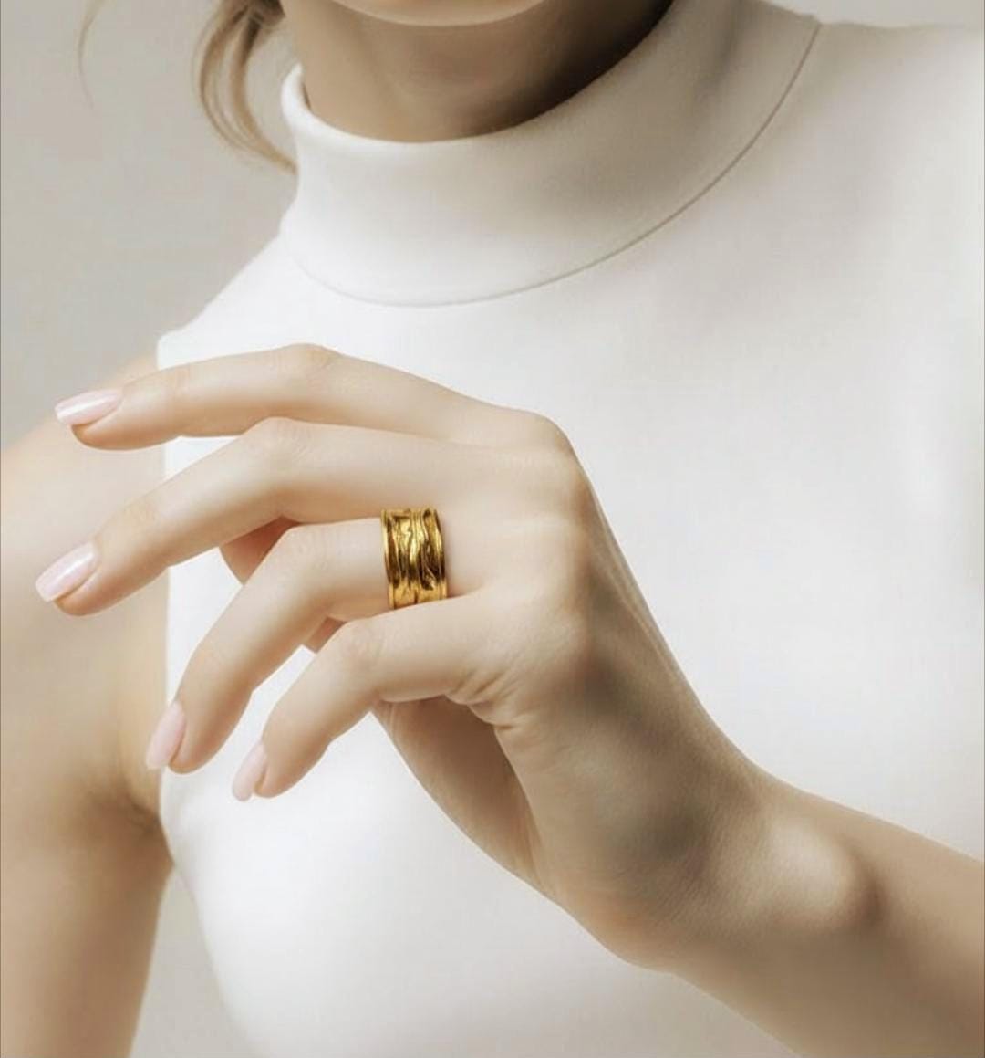 A bold yet clean design that works as a single statement ring or stacked with slimmer bands. The organic folds give it a sculptural, handmade feel that suits both casual and dressy outfits.