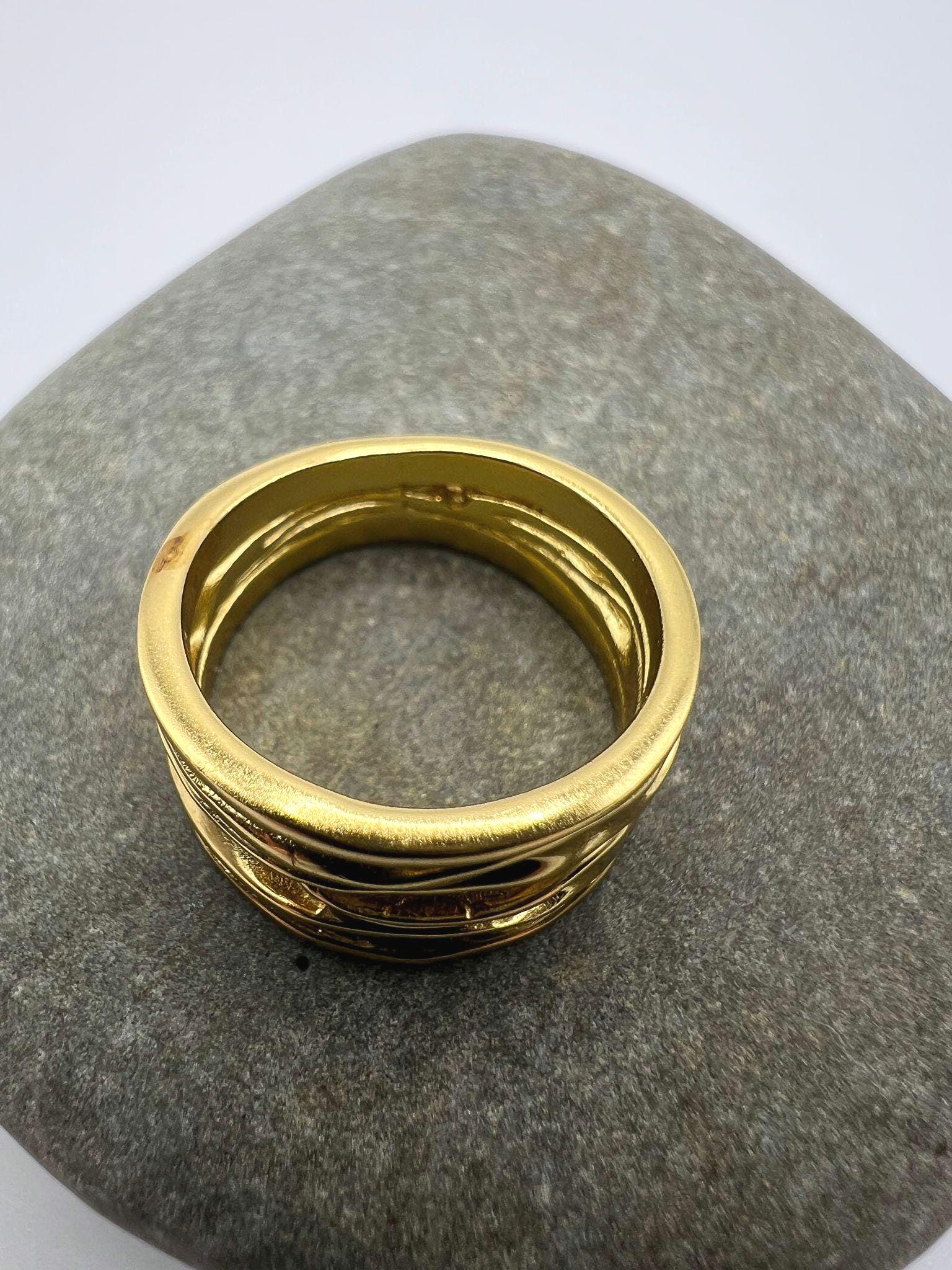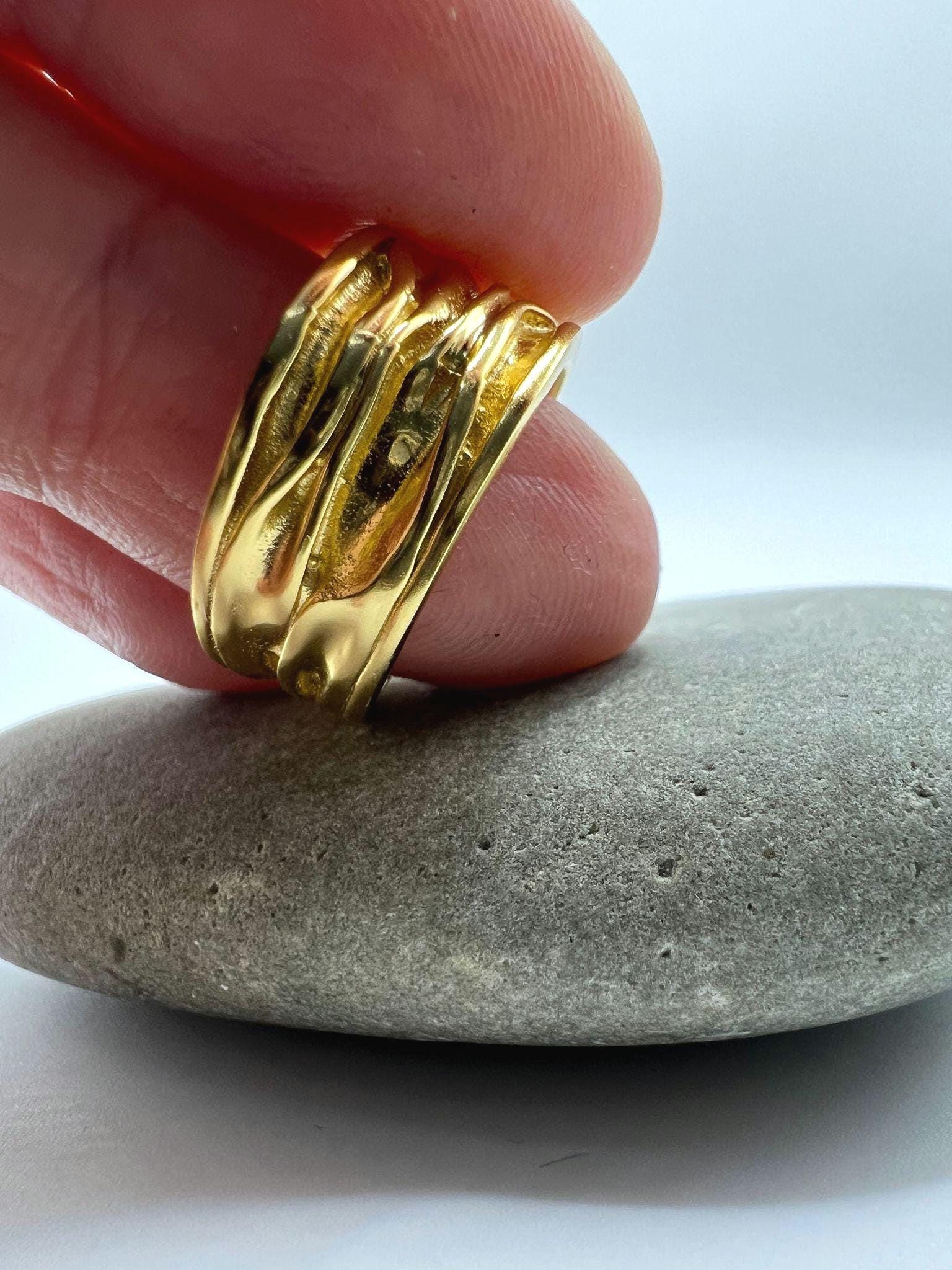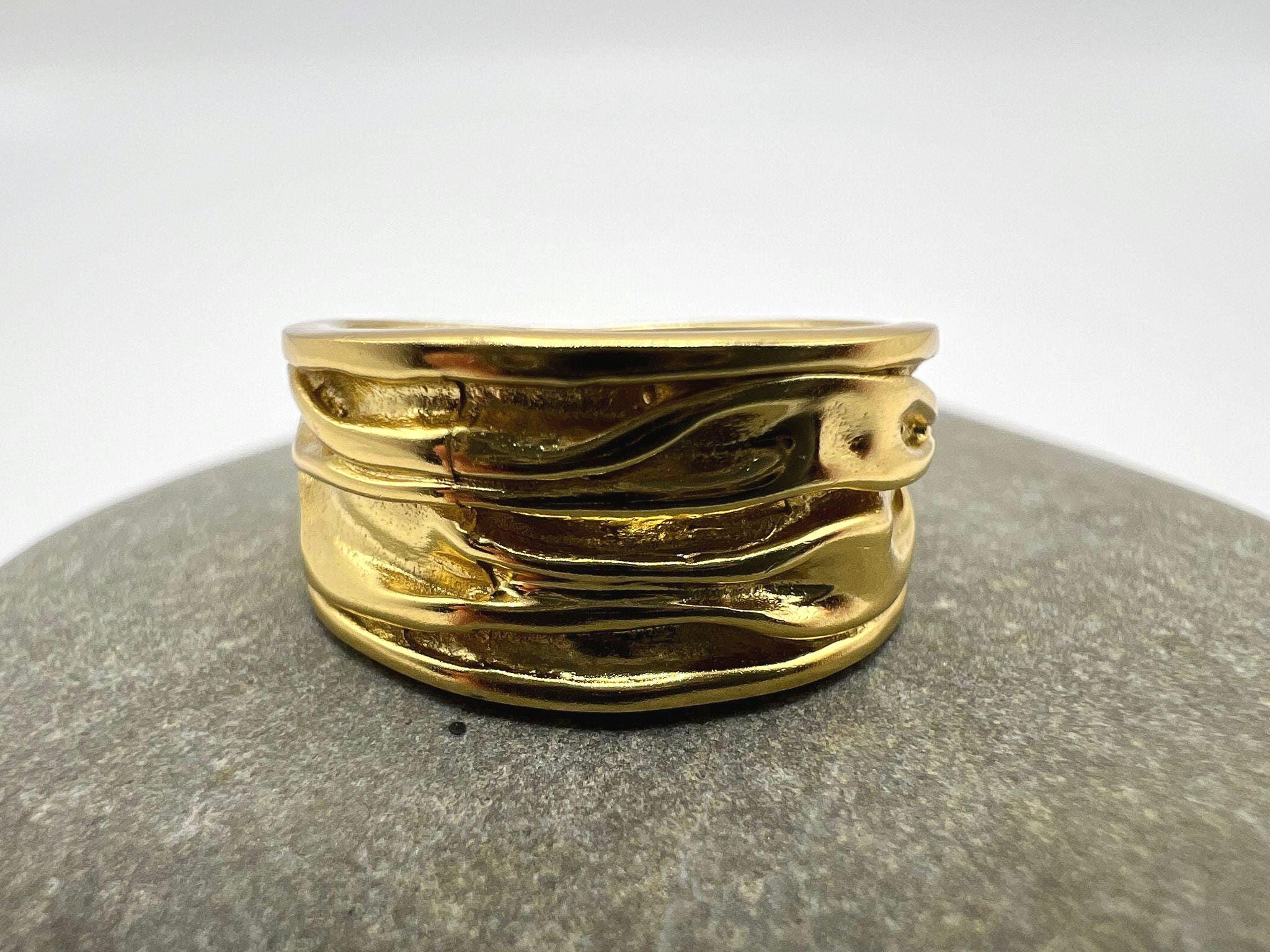 A bold yet clean design that works as a single statement ring or stacked with slimmer bands. The organic folds give it a sculptural, handmade feel that suits both casual and dressy outfits.