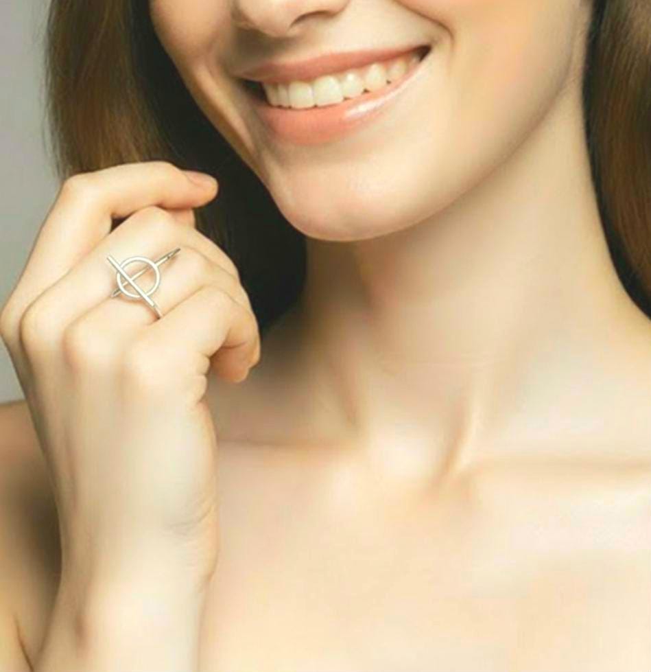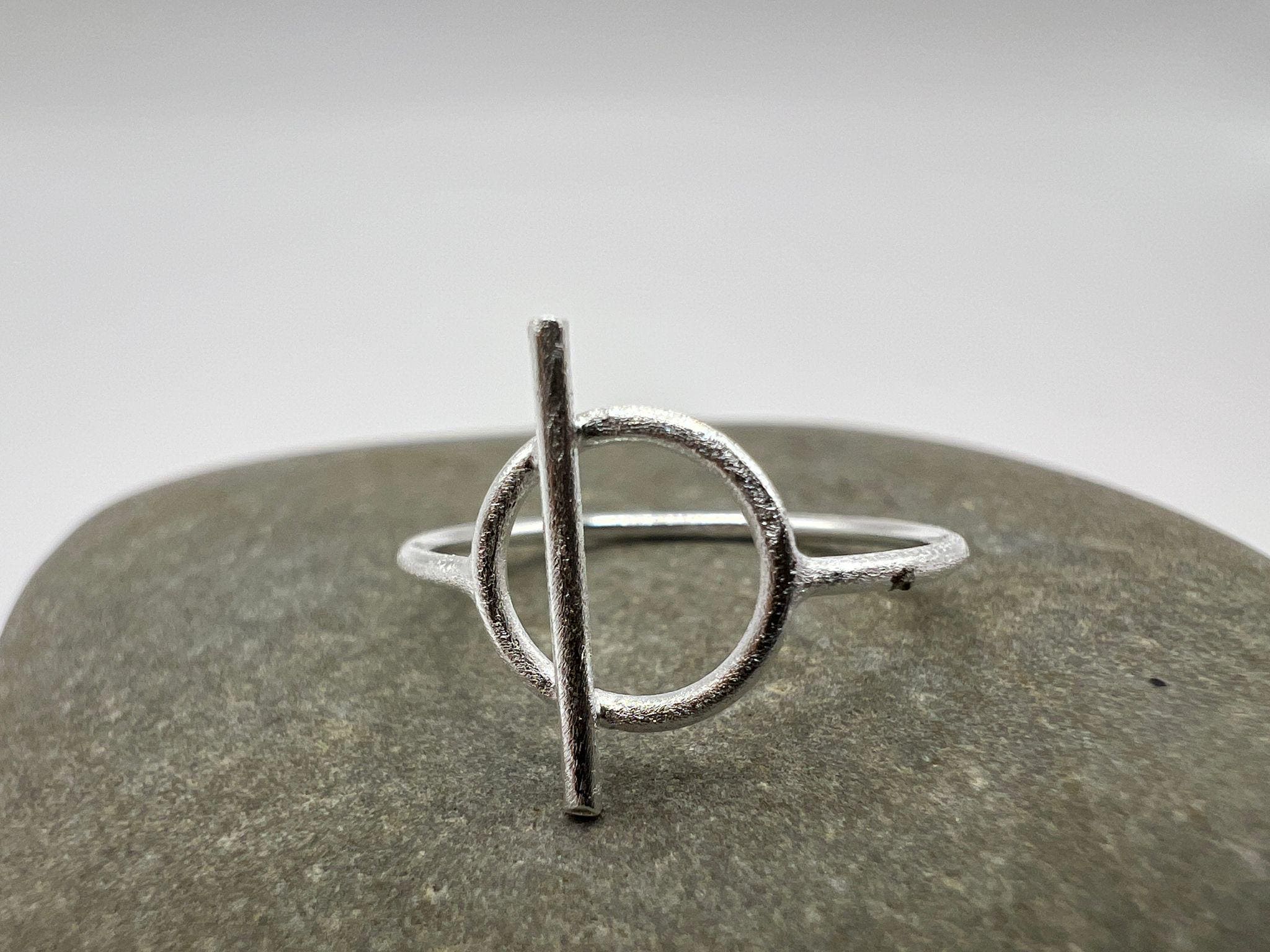 The design features a geometric circle crossed by a vertical bar, creating a clean, modern aesthetic that suits everyday wear as well as elegant looks.