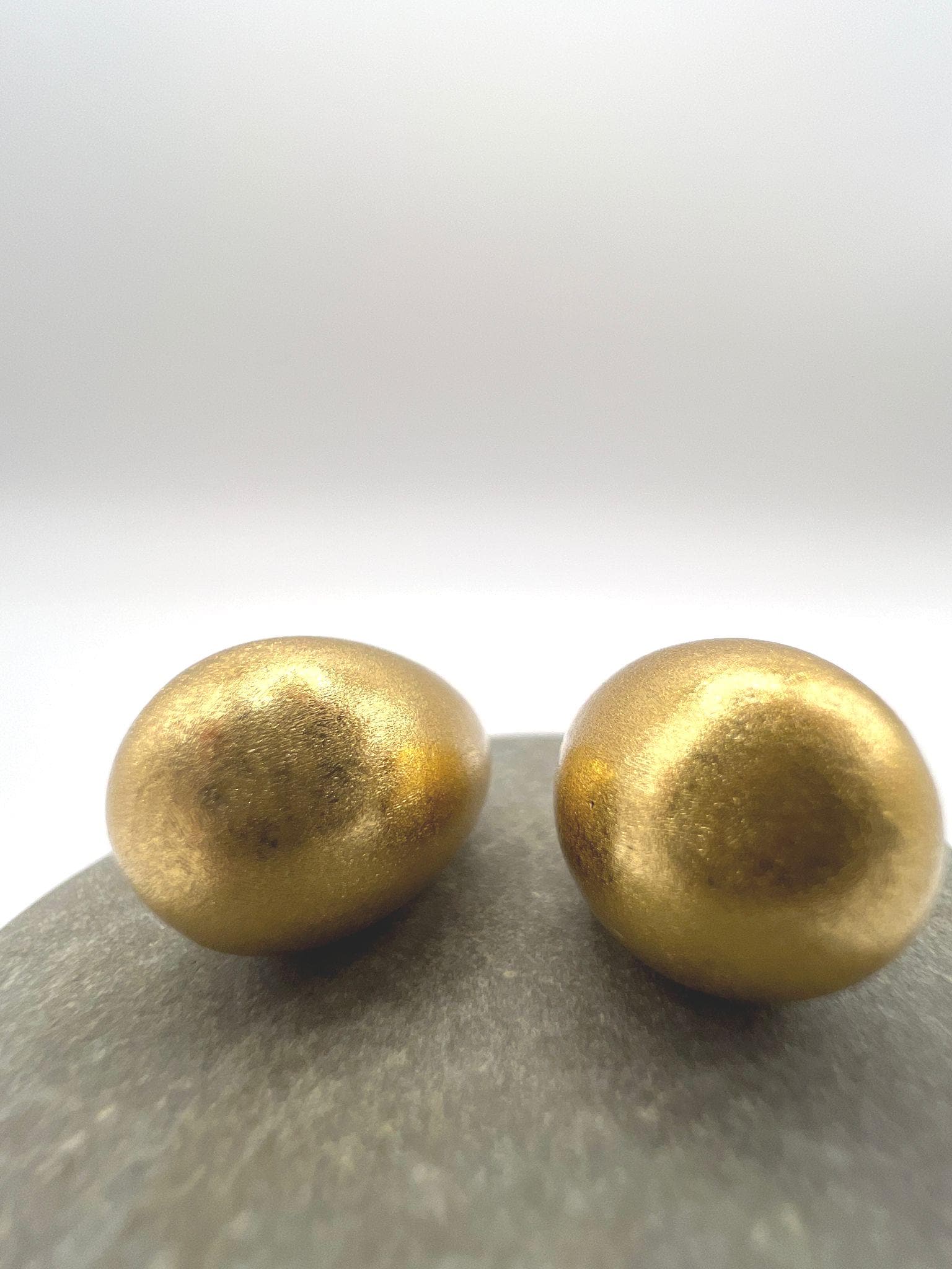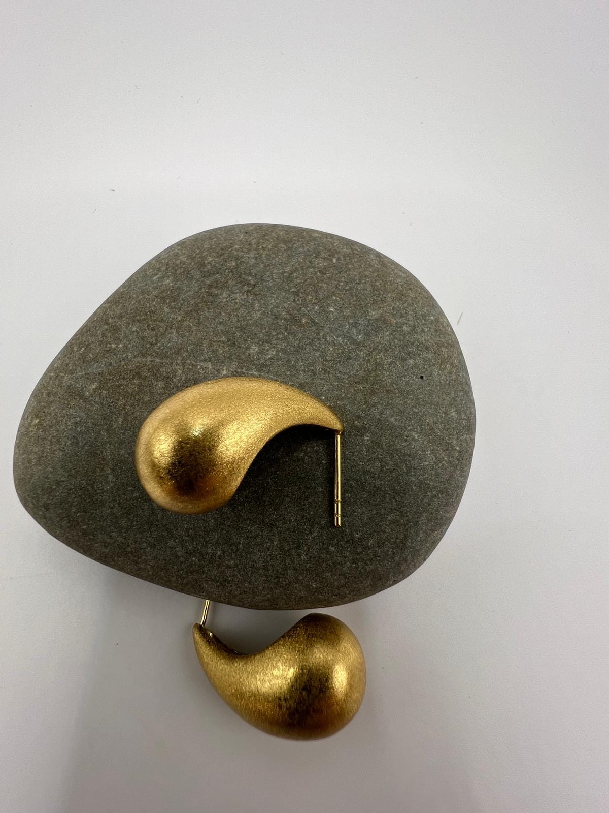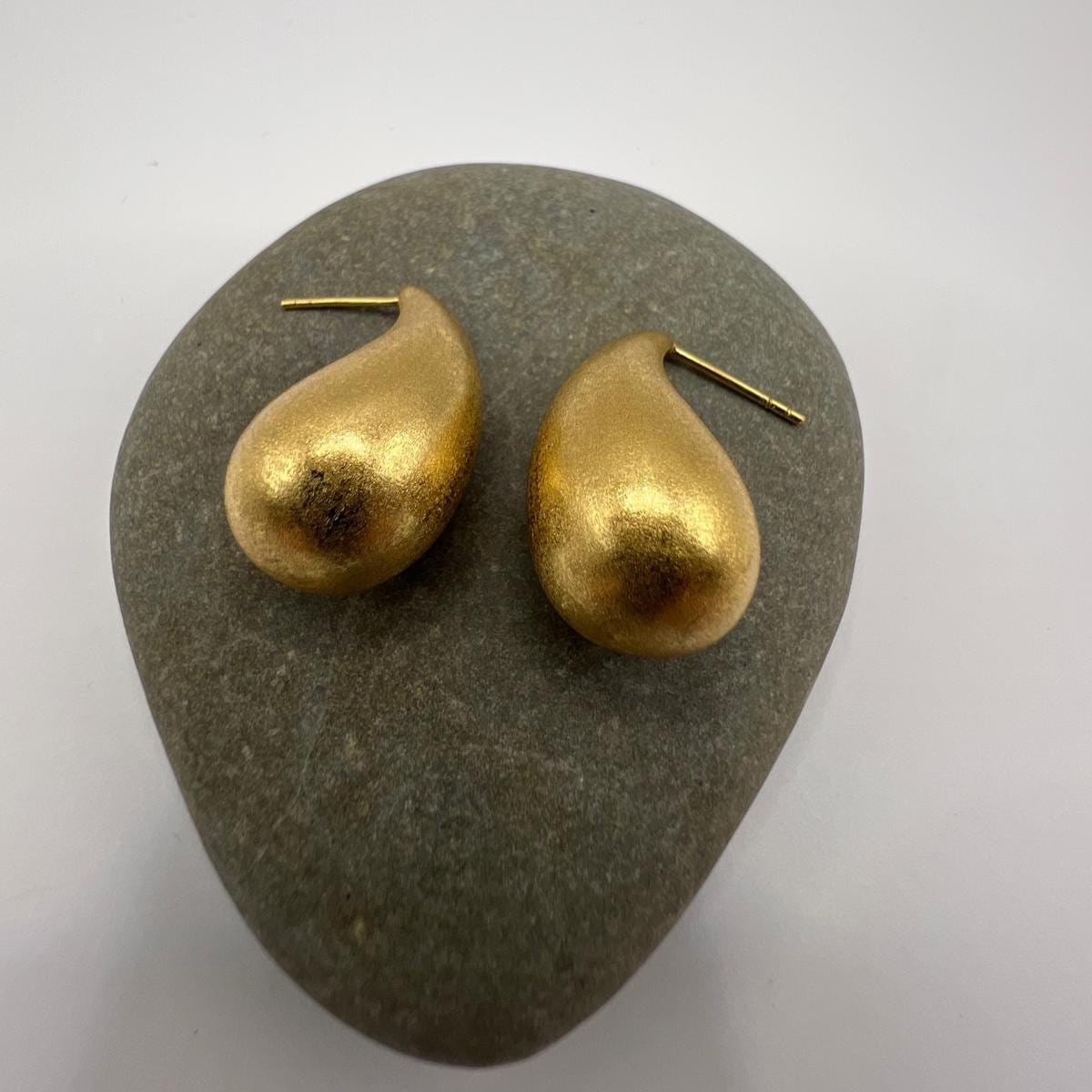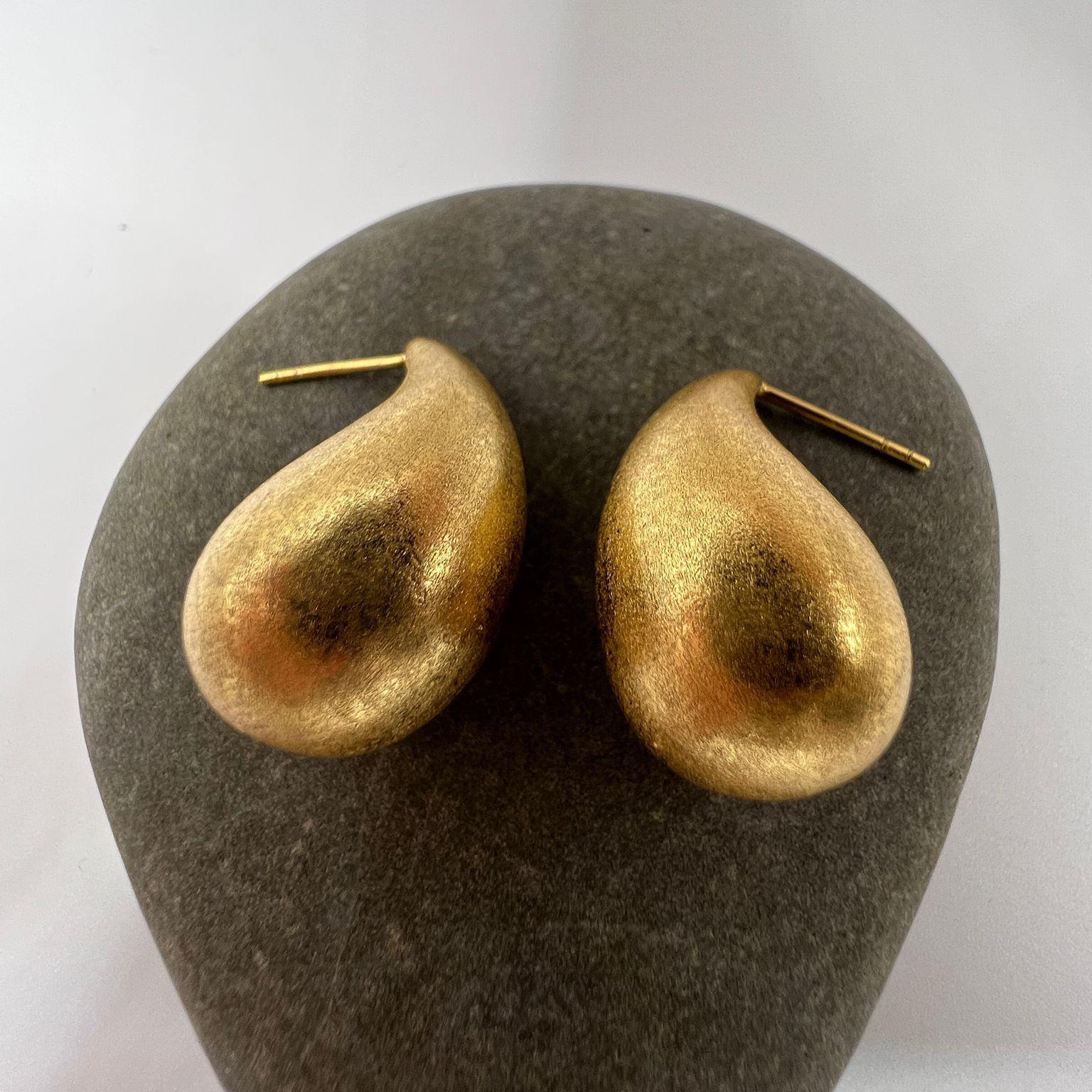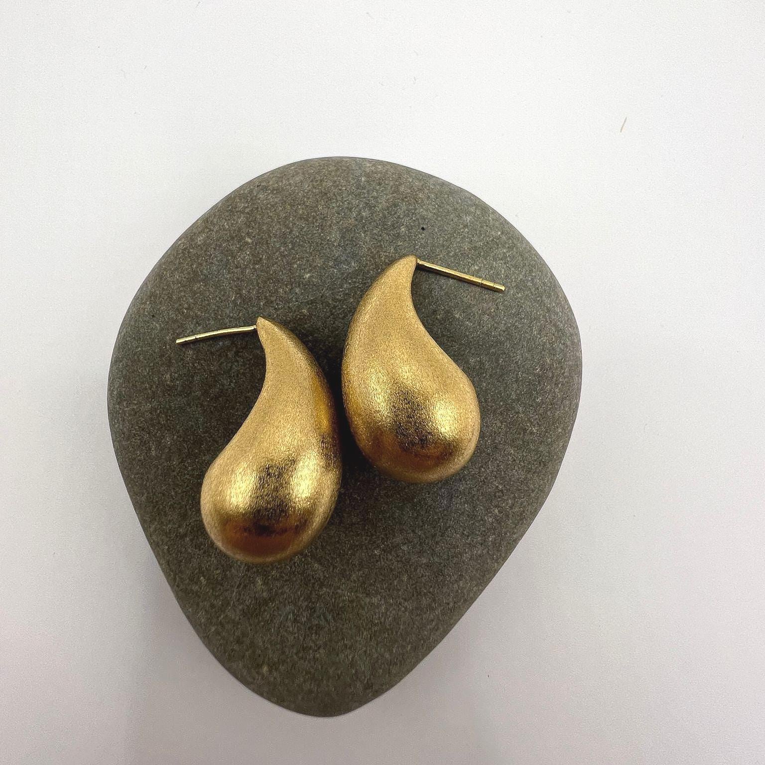 Bold sculptural teardrop stud earrings in 18k gold plated 925 silver with a textured matte finish. Voluminous, organic and eye-catching, shaped like fluid golden droplets that sit beautifully on the ear.