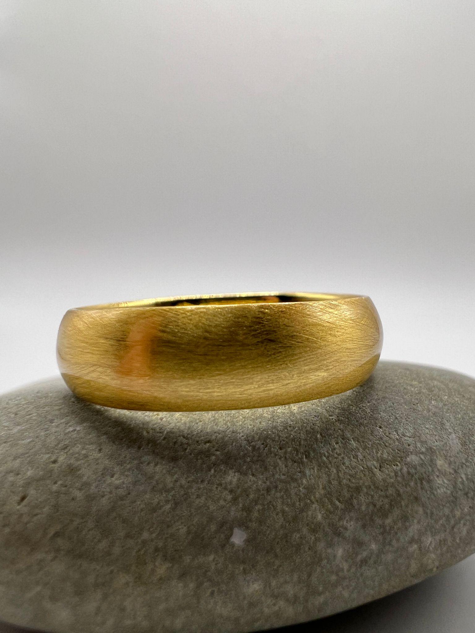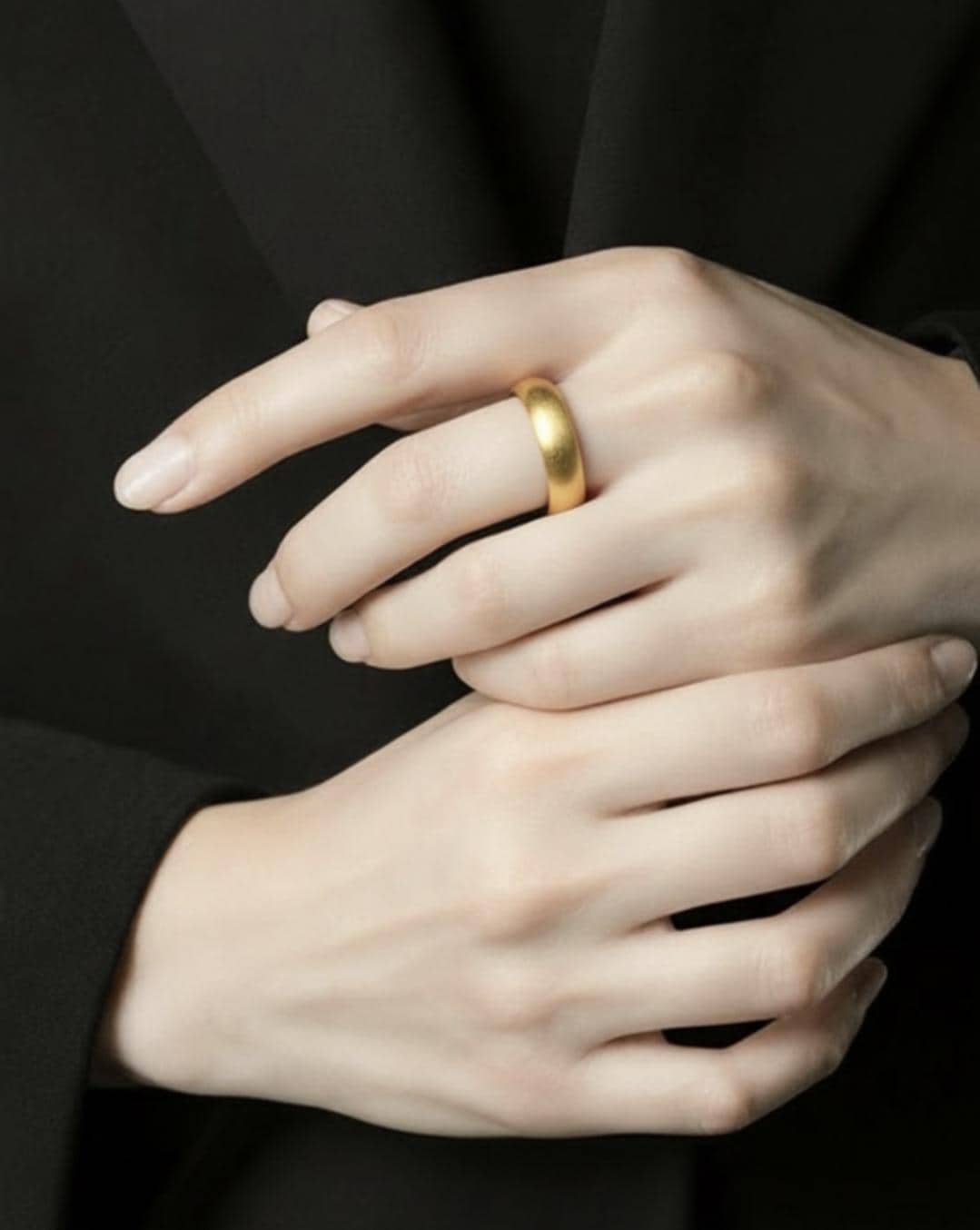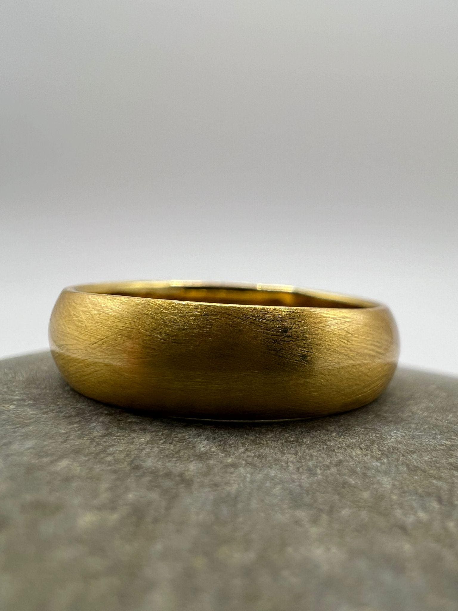 This unisex band ring features a smooth, softly curved profile with a matte brushed gold surface. Its clean silhouette makes it ideal as an everyday ring, statement band, or modern wedding band.
