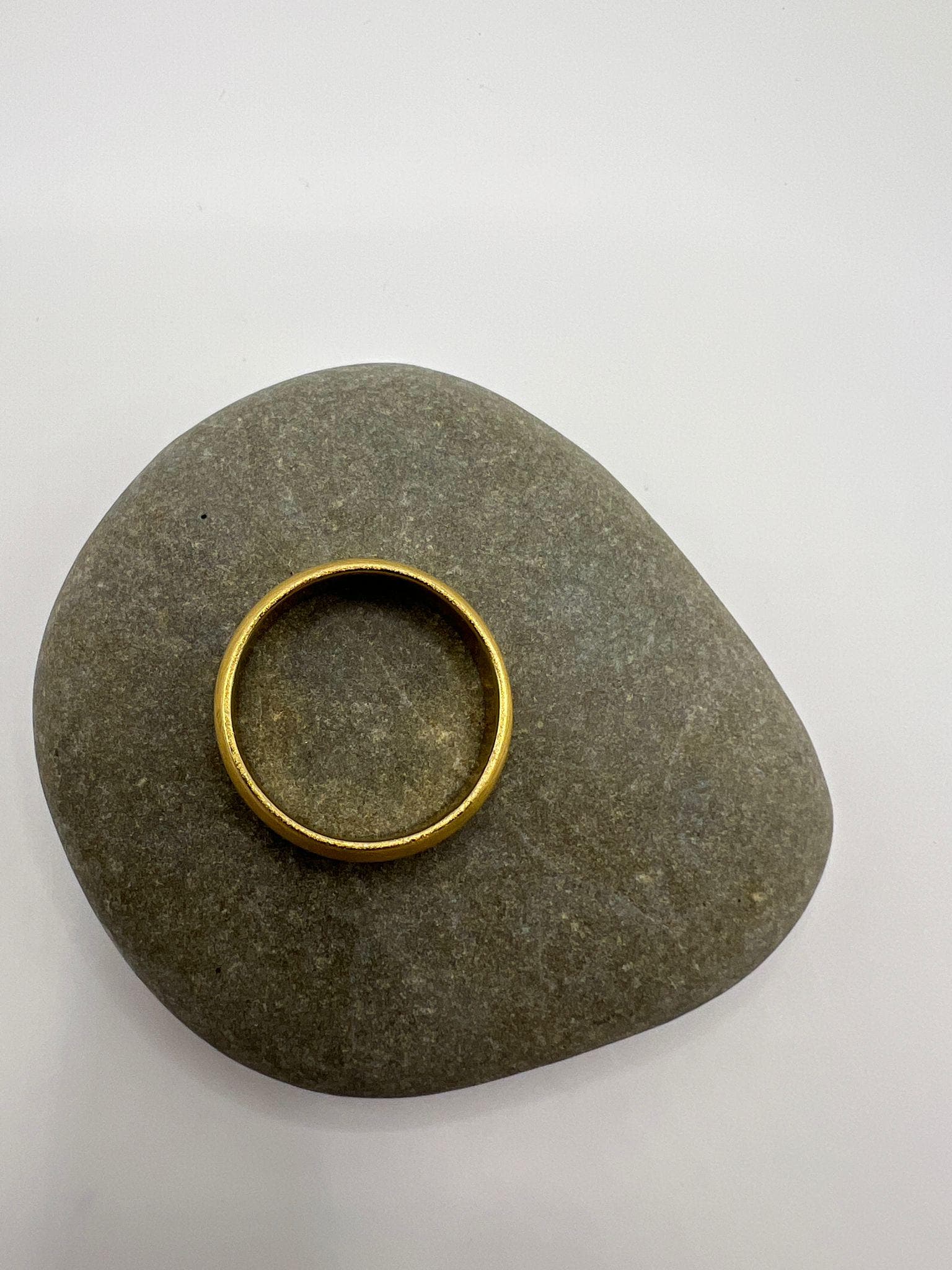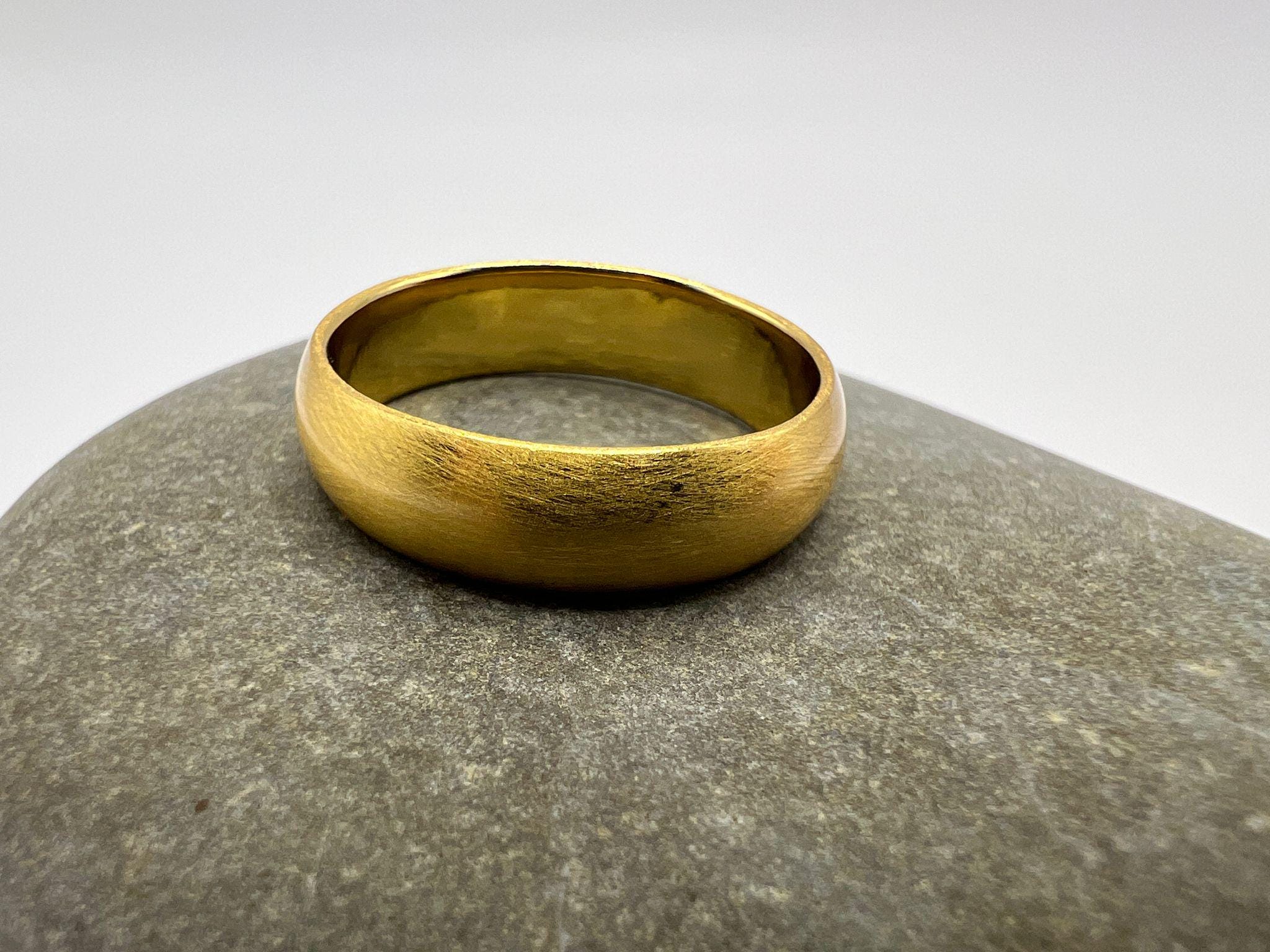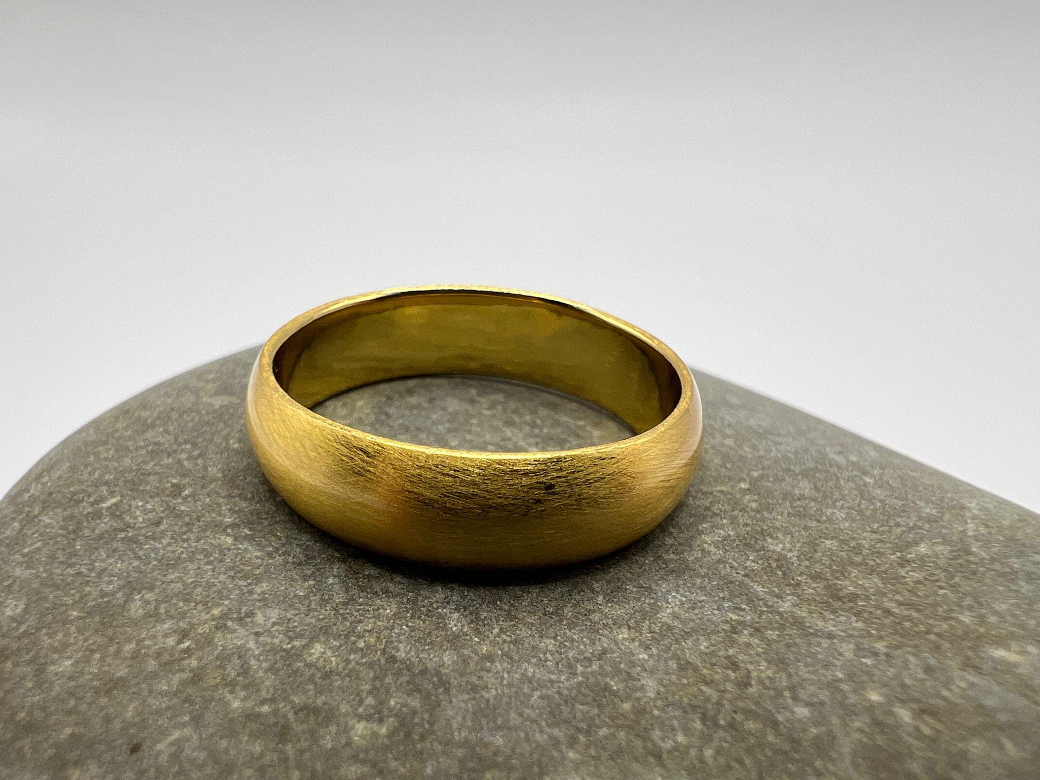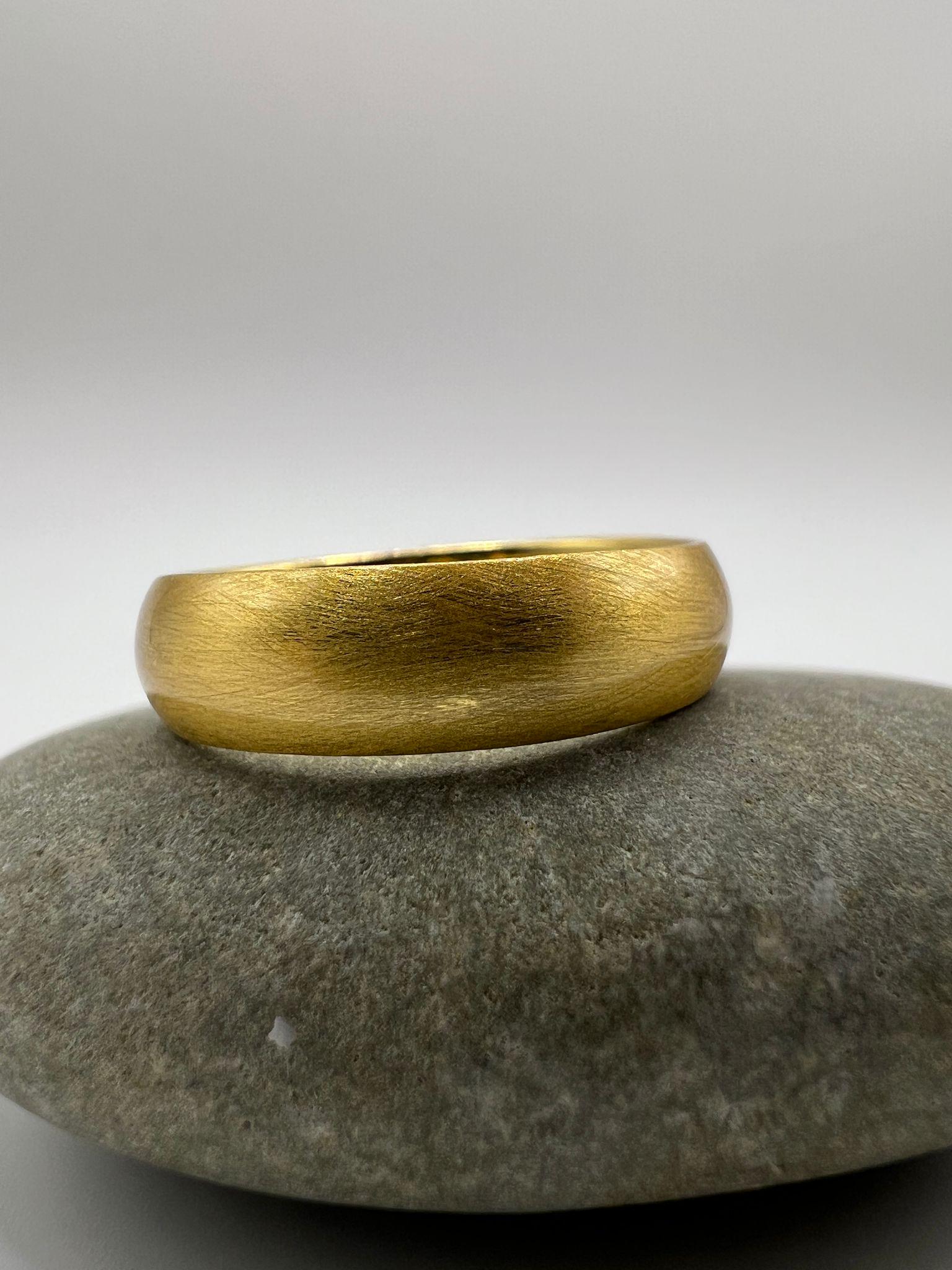 This unisex band ring features a smooth, softly curved profile with a matte brushed gold surface. Its clean silhouette makes it ideal as an everyday ring, statement band, or modern wedding band.
