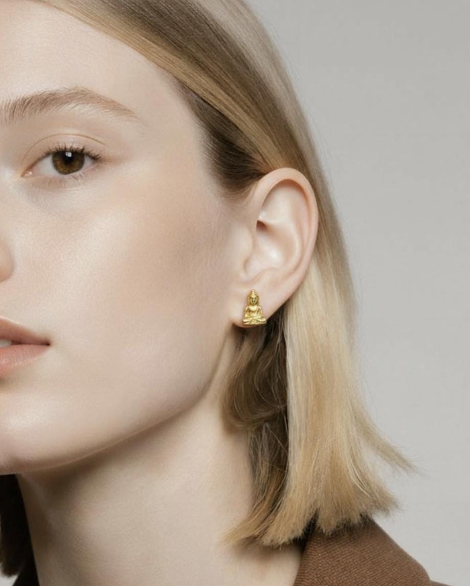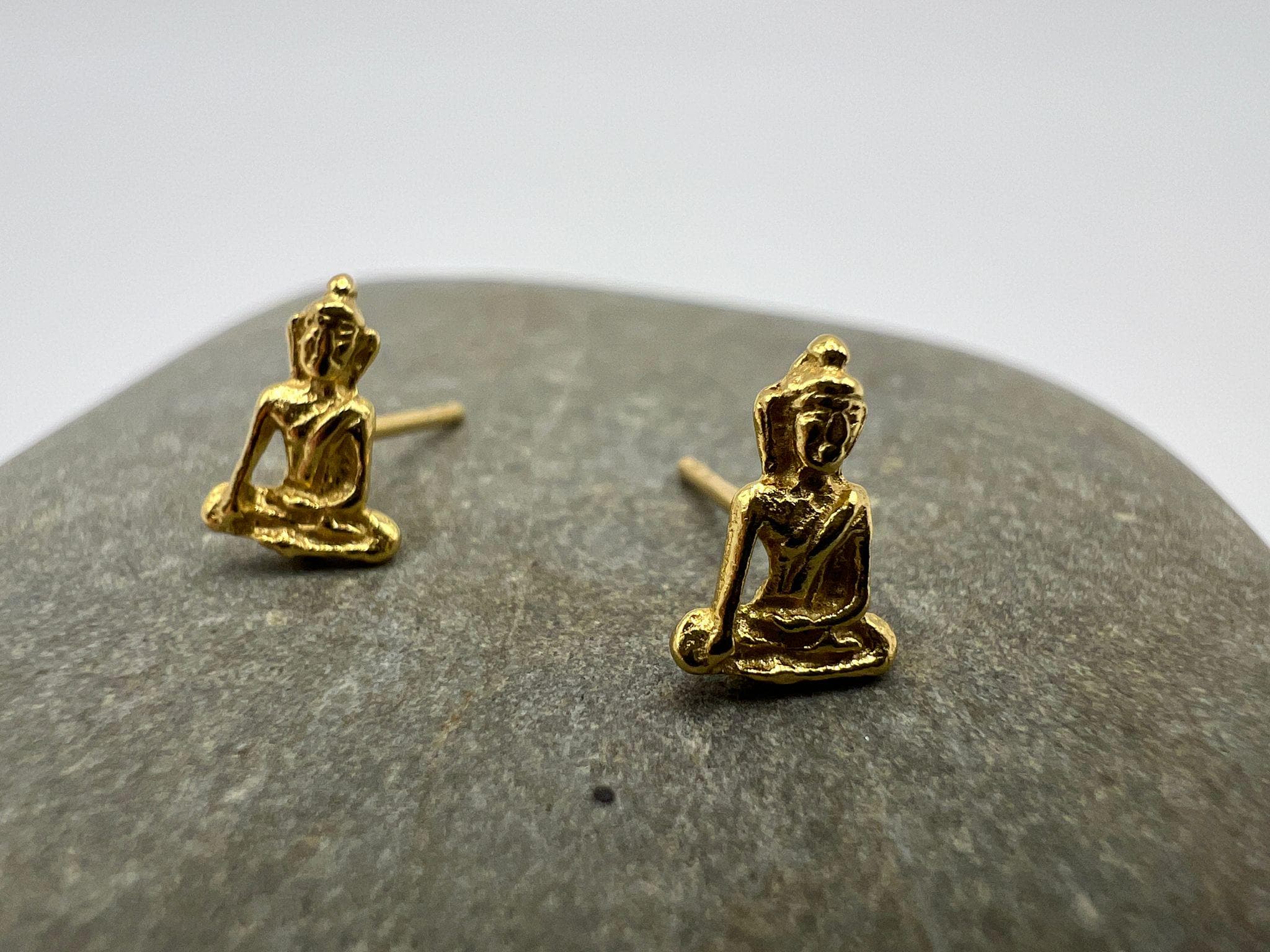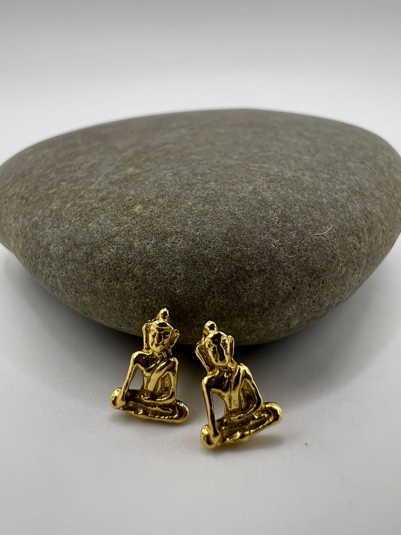 Delicate Buddha-motif stud earrings crafted in 18k gold-plated 925 silver. A small, sculptural figure sitting in meditation creates a meaningful and symbolic accessory for yoga lovers, spiritual practitioners or anyone who appreciates mindful jewelry.