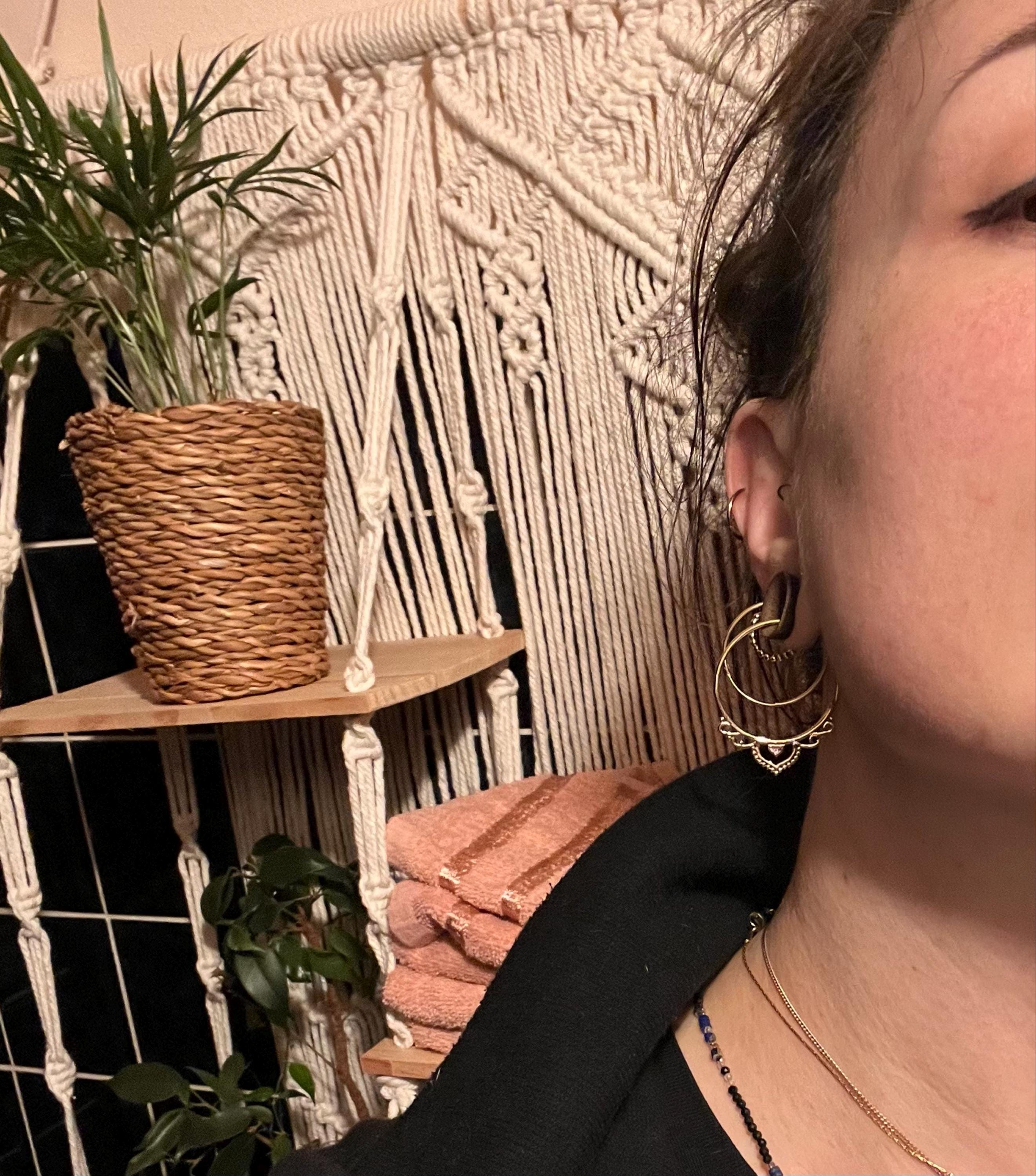 Elegant handmade middle-sized boho hoop earrings with an oriental pattern.